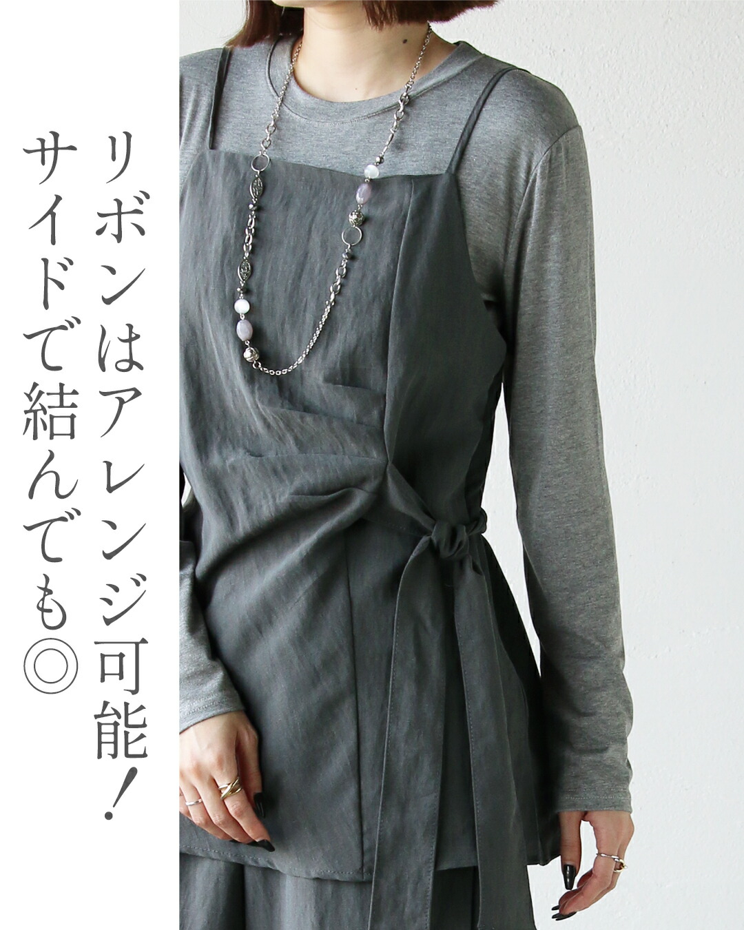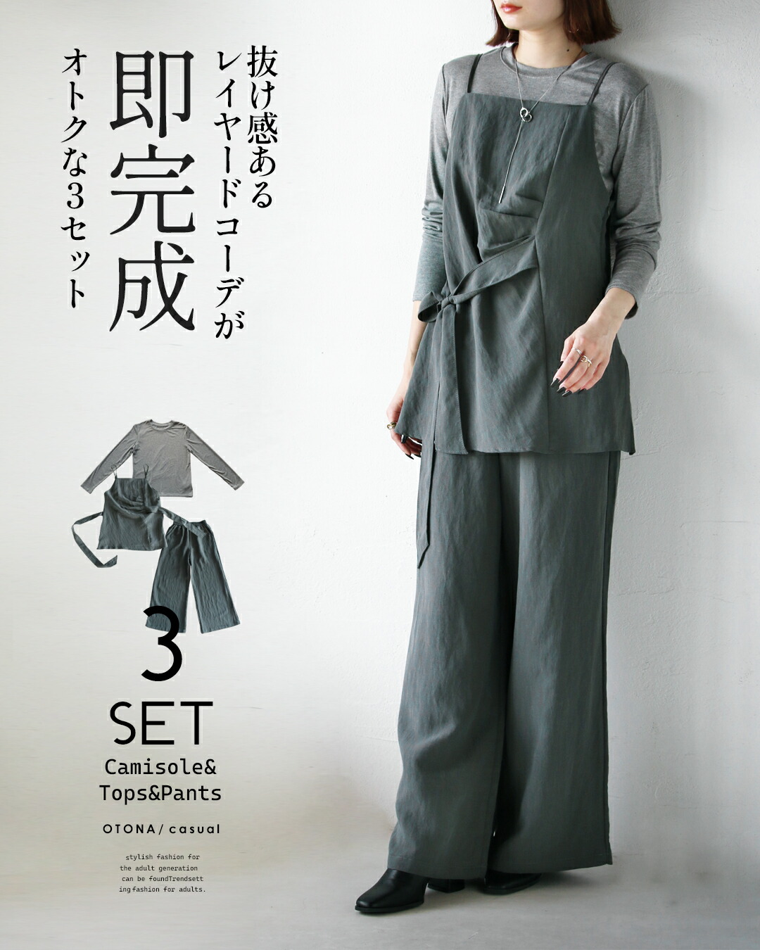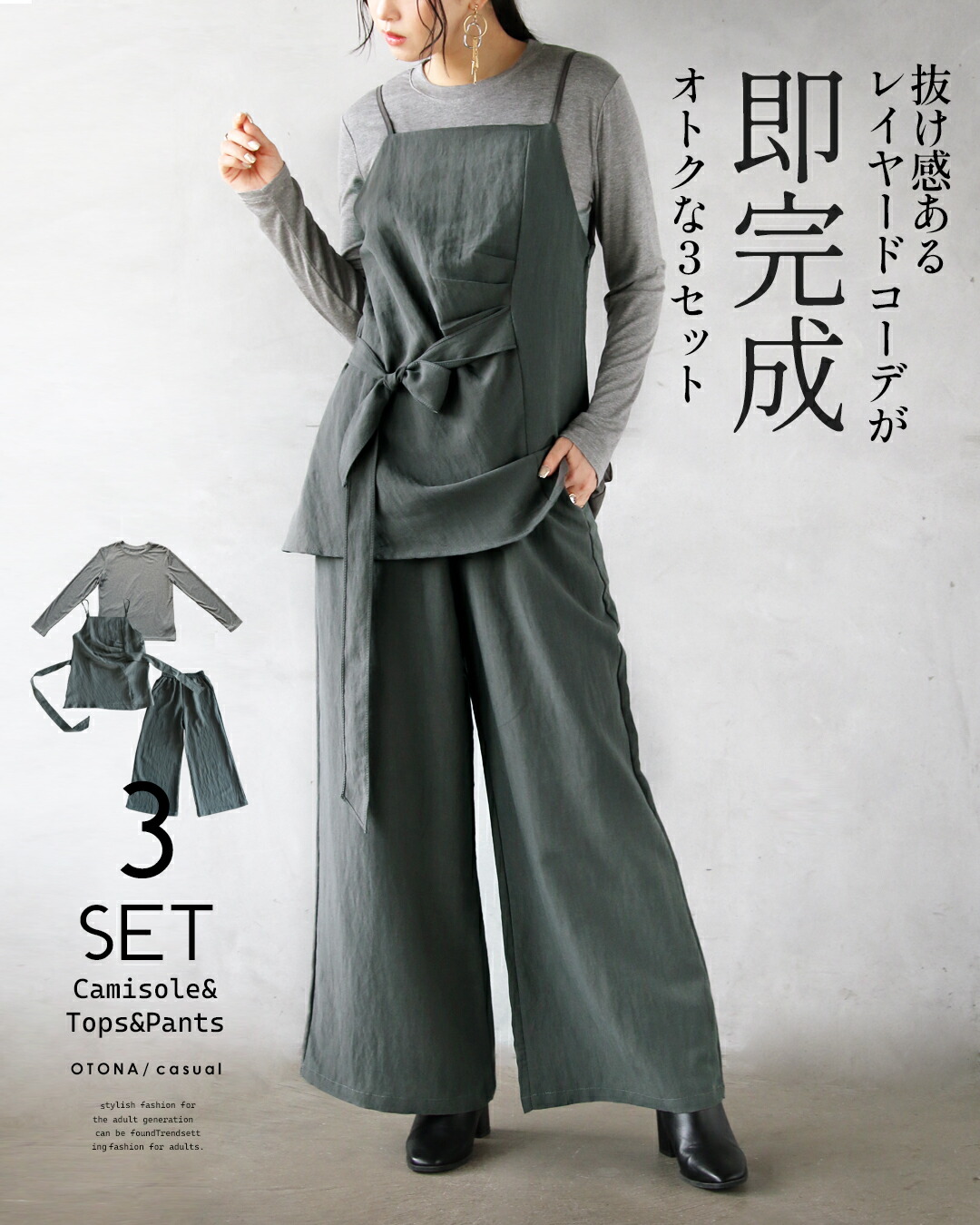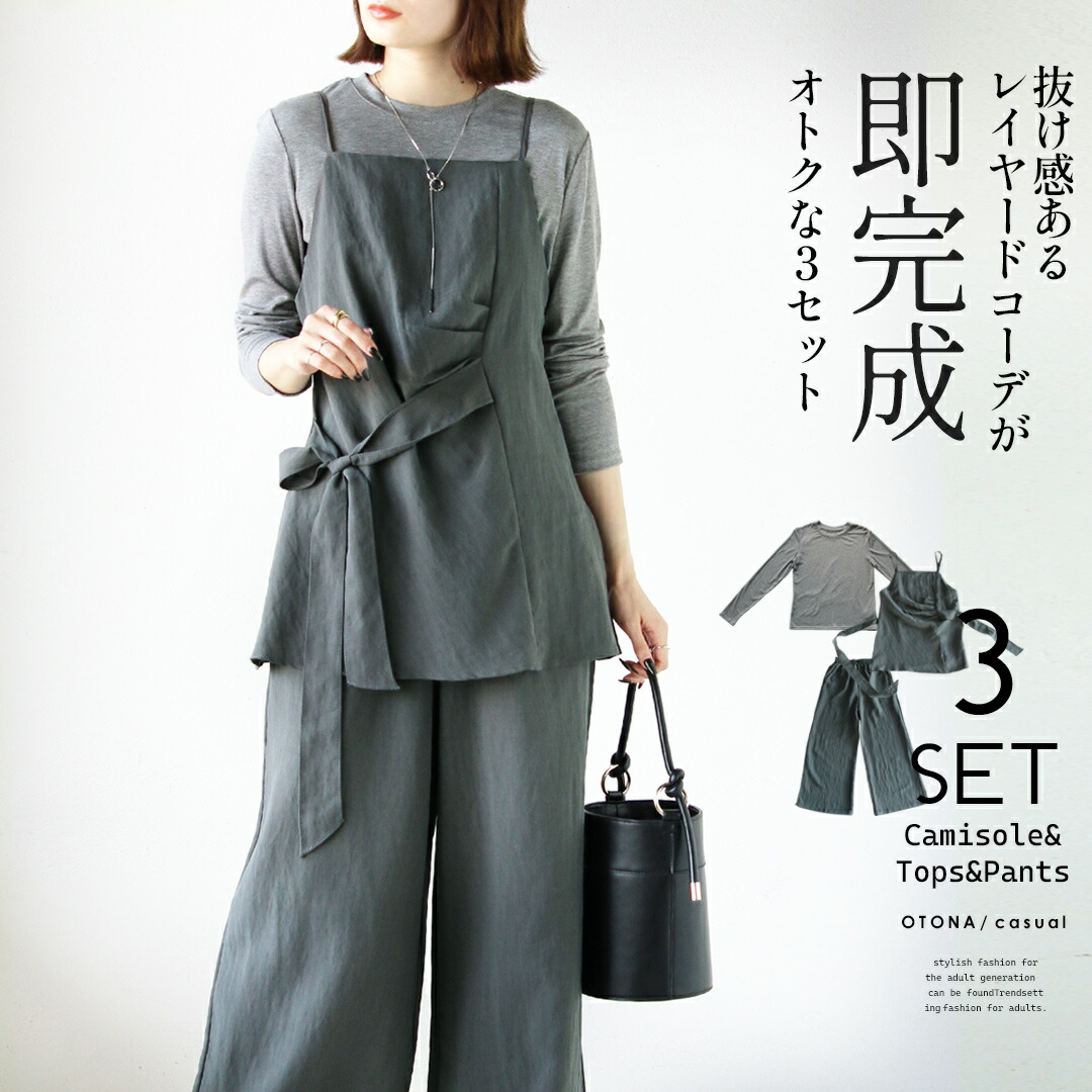 トップス・キャミベスト・ワイドパンツの3点が揃ったセットアップ。キャミベストにはタックデザインやリボン付きで、サイドやフロントに結んでシルエットを自在に変えられる個性的なデザインが魅力。着回し力抜群のシンプルなトップスとワイドパンツがセットで超お得!コーデを考えずに、着るだけでこなれ感のある大人のレイヤードスタイルが完成します。