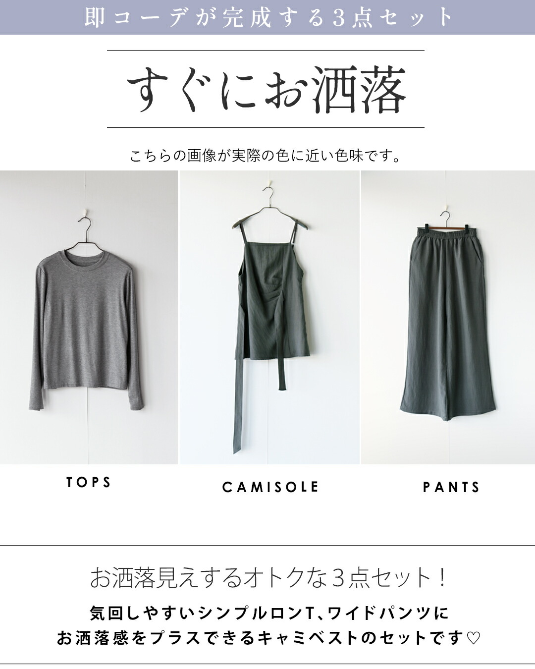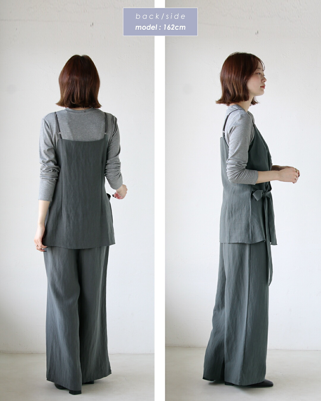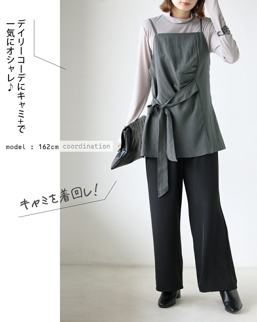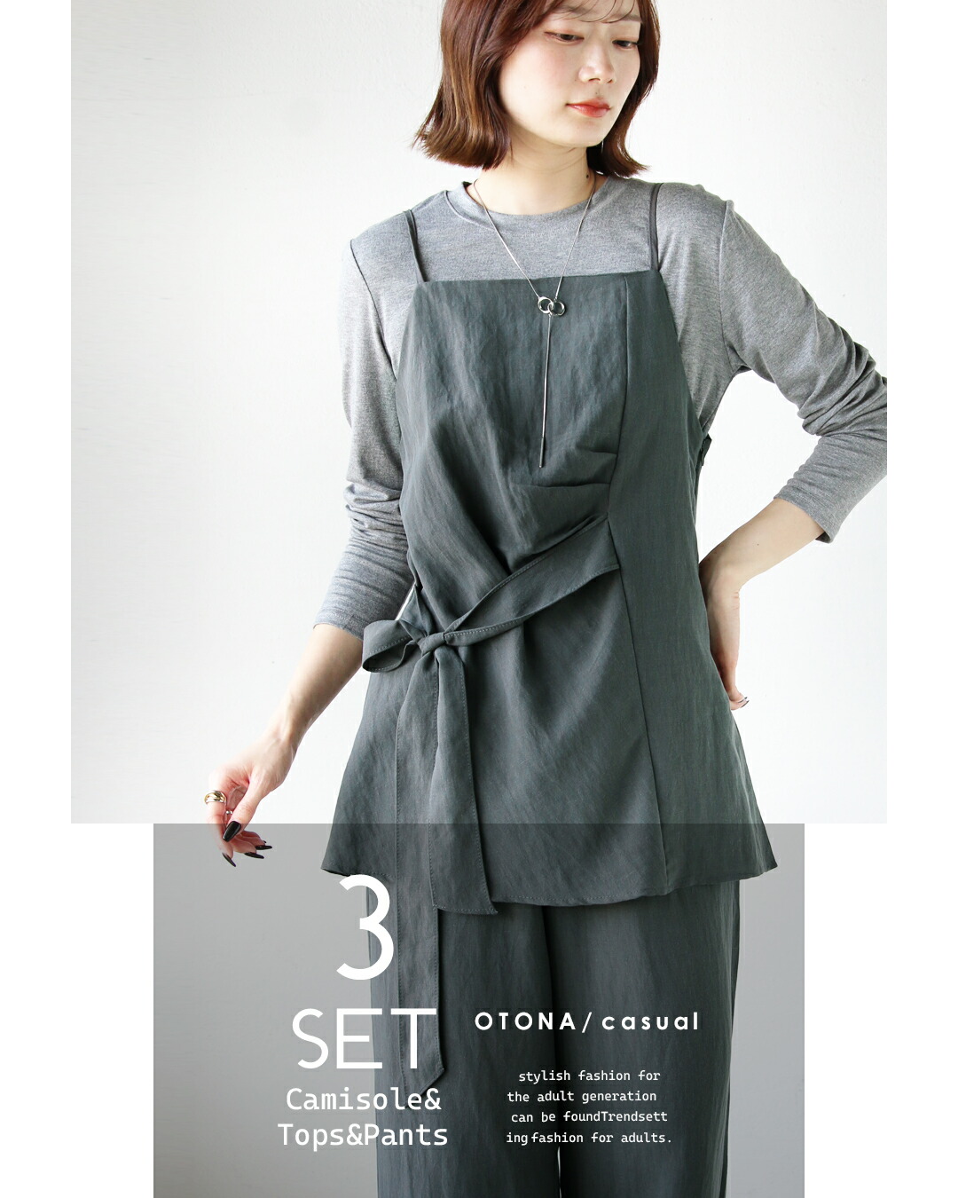 トップス・キャミベスト・ワイドパンツの3点が揃ったセットアップ。キャミベストにはタックデザインやリボン付きで、サイドやフロントに結んでシルエットを自在に変えられる個性的なデザインが魅力。着回し力抜群のシンプルなトップスとワイドパンツがセットで超お得!コーデを考えずに、着るだけでこなれ感のある大人のレイヤードスタイルが完成します。