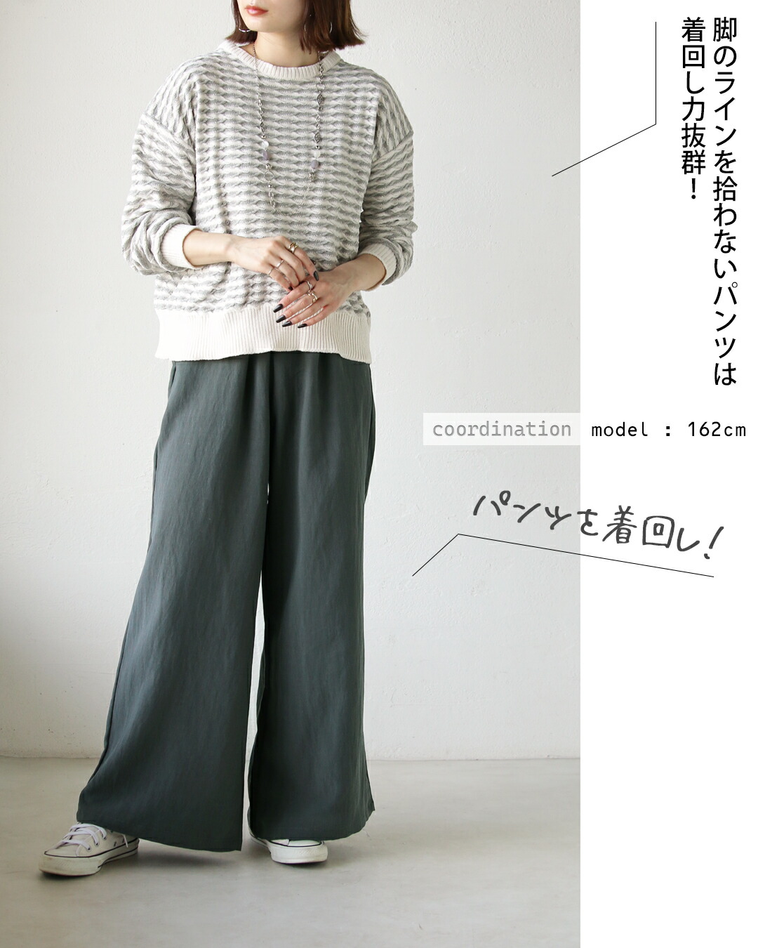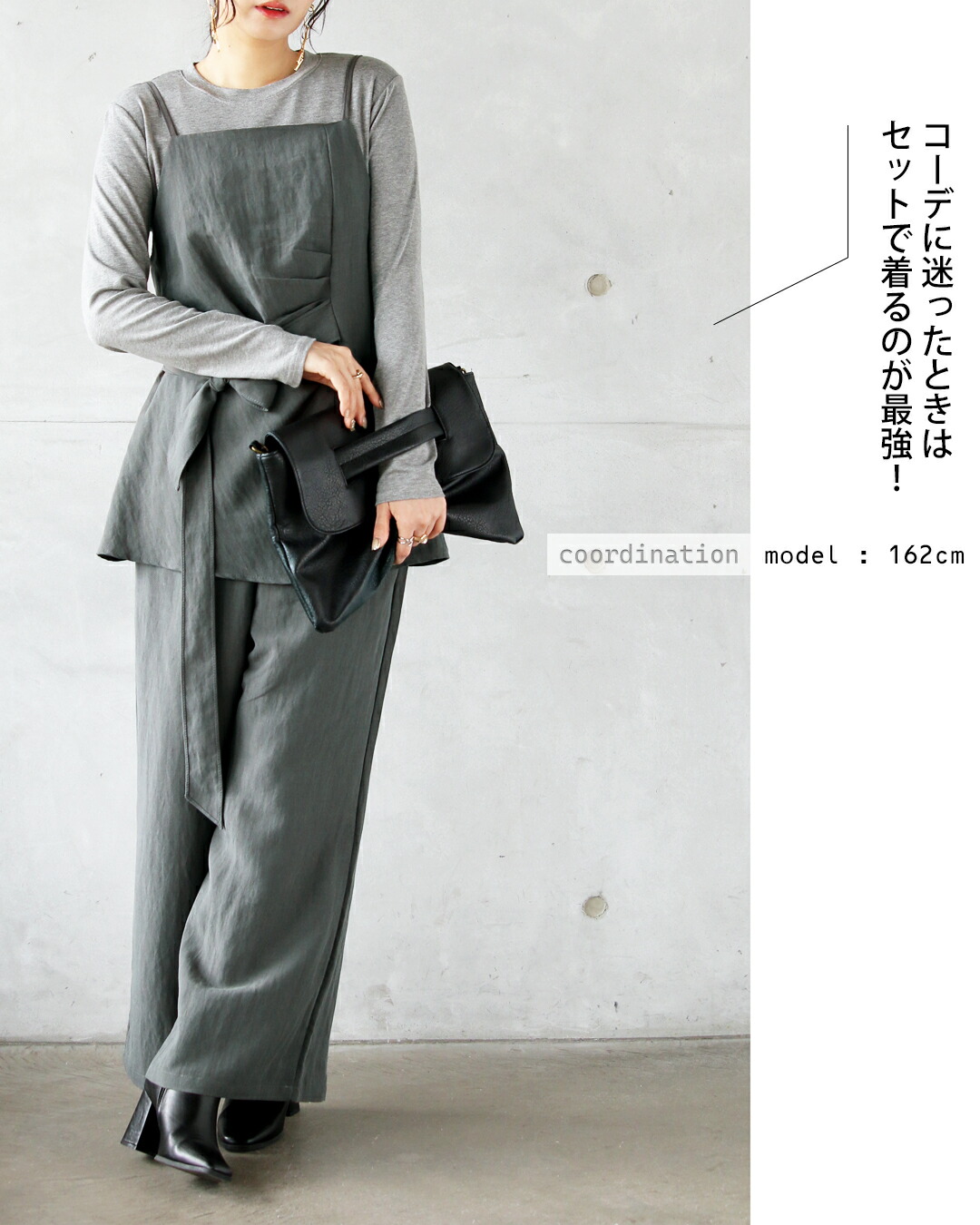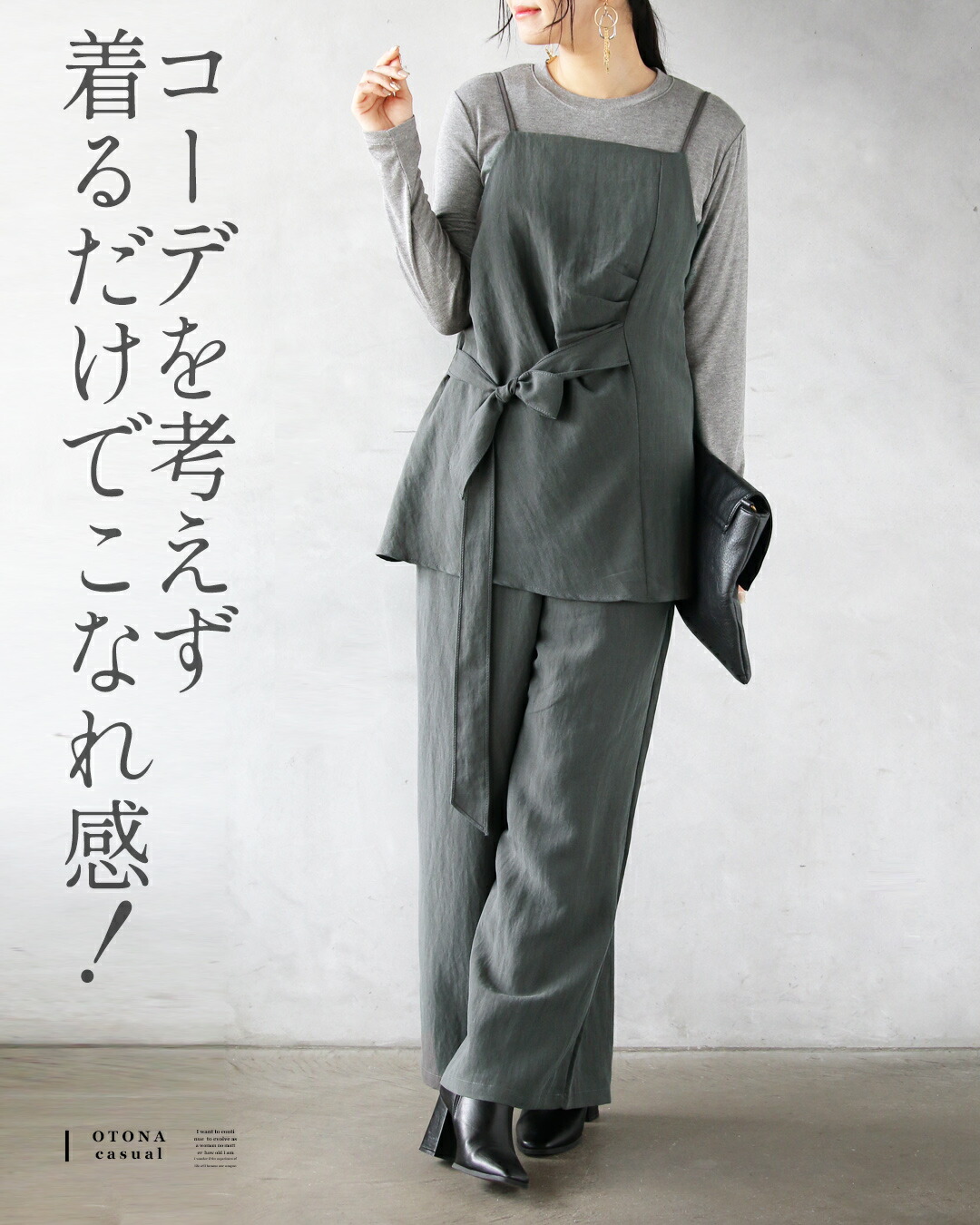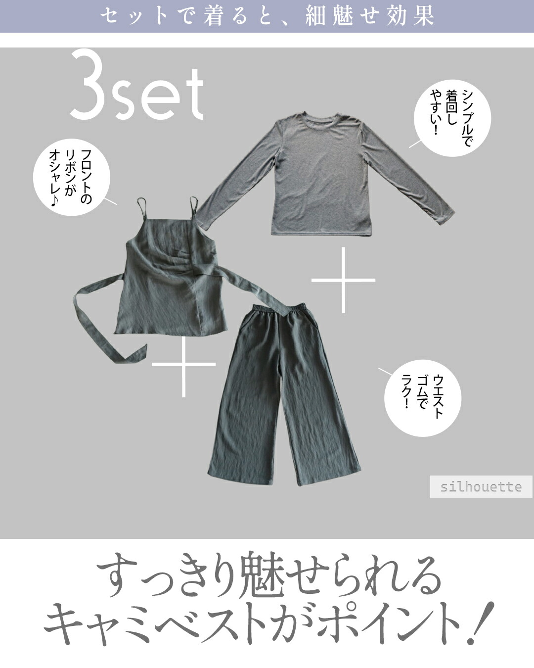 トップスはゆったりとしたリラックス感のあるシルエット。キャミを重ねることでウエストマークされ、バランスよくすっきりと見える効果も。パンツは脚のラインを拾わないワイドシルエットで、動きやすさと美脚効果を兼ね備えています。