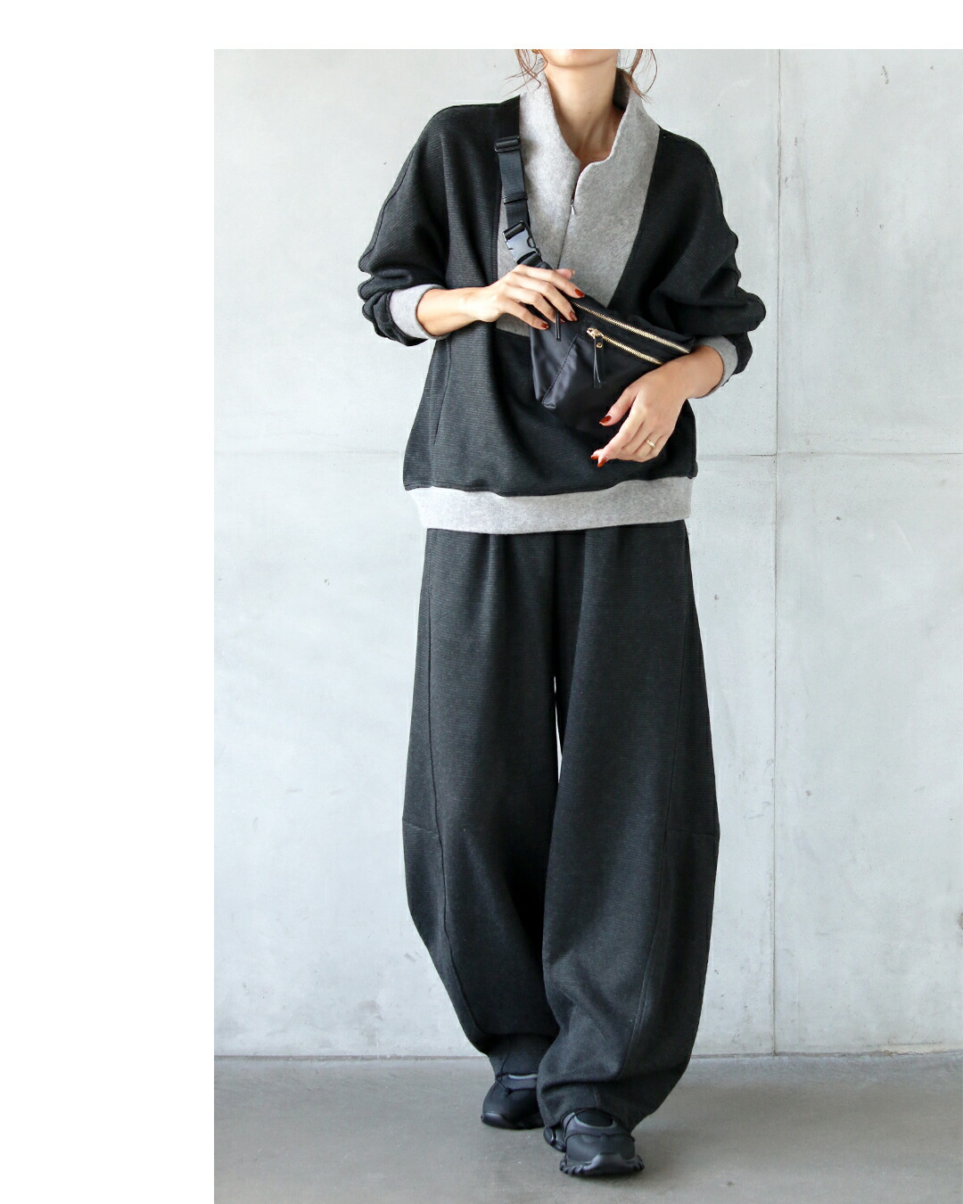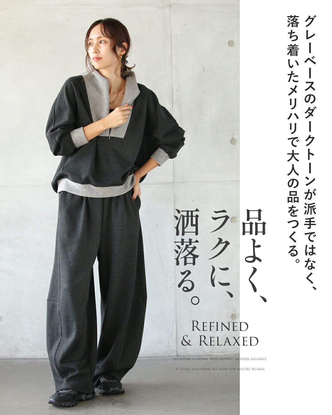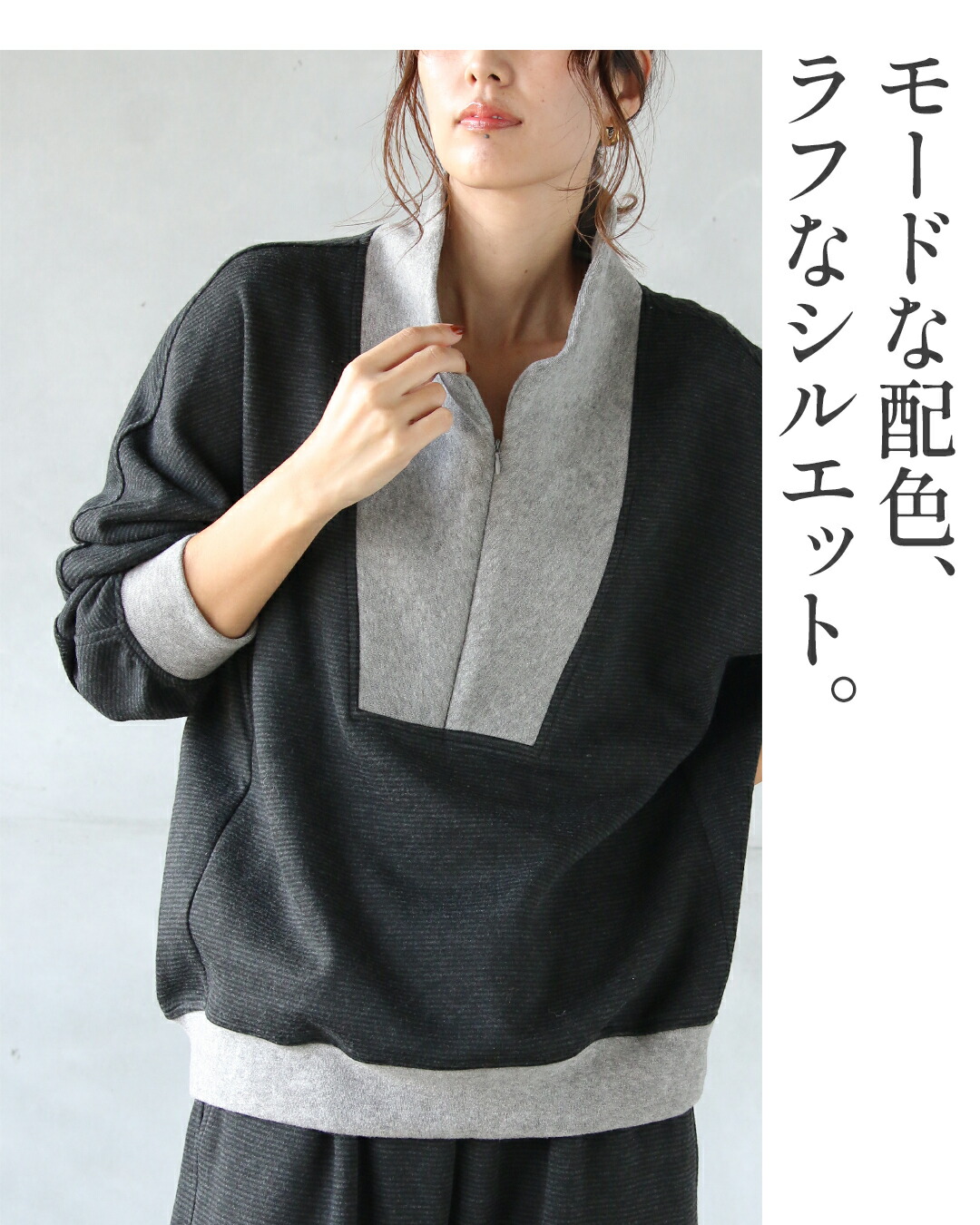 力を抜いて着られるのに、ちゃんとカッコいい。トップスは、ハーフジップの異素材切り替え。モードな配色で遊び心あるデザインに。袖には立体ラインが入りすっきり細見え効果も◎チャコールグレーをベースに、衿元・袖口・裾に配したライトグレーが、全体を引き締めながらも重くなりすぎないバランスに仕上げています。
