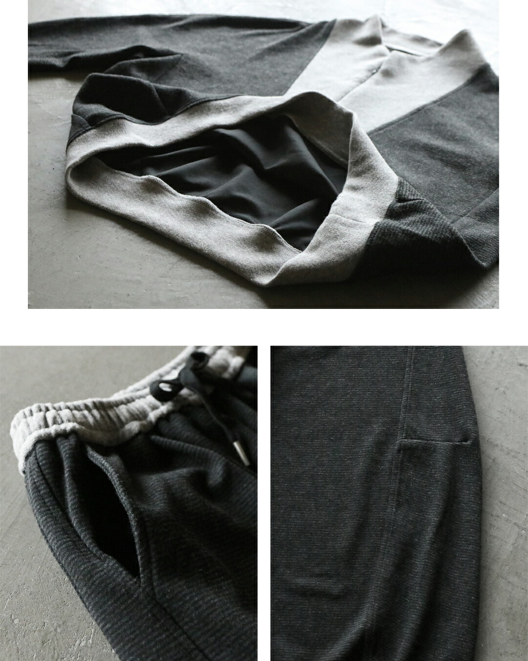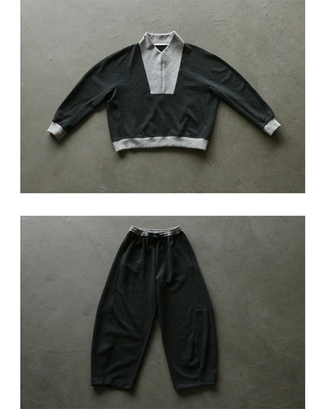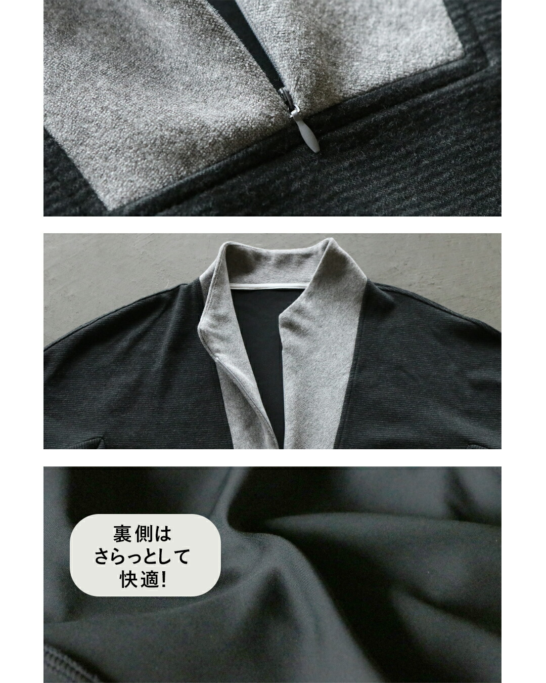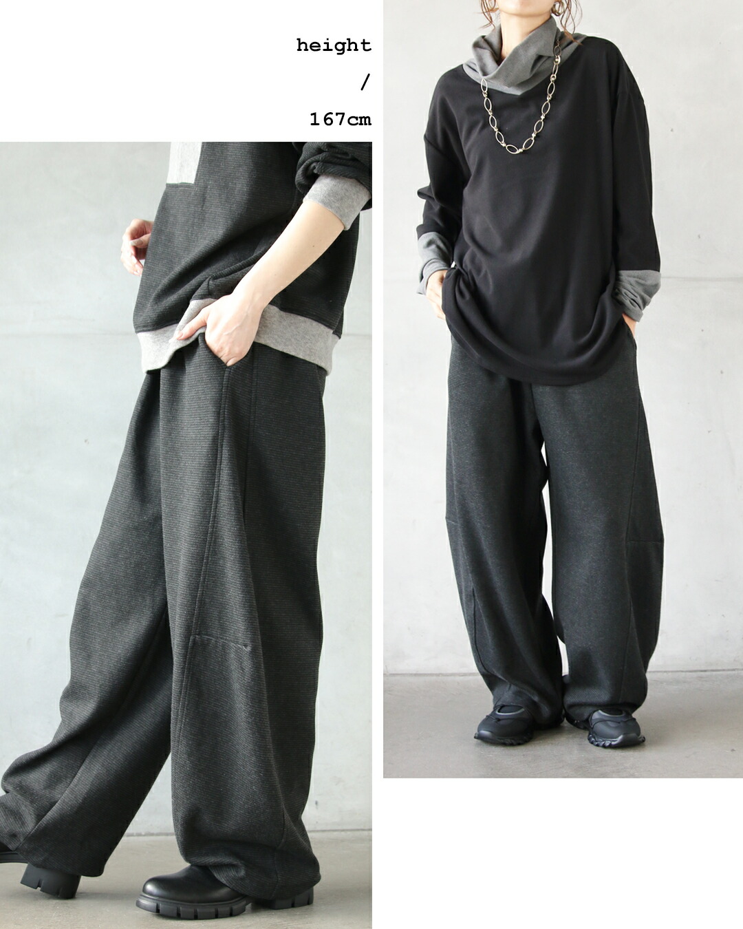 力を抜いて着られるのに、ちゃんとカッコいい。トップスは、ハーフジップの異素材切り替え。モードな配色で遊び心あるデザインに。袖には立体ラインが入りすっきり細見え効果も◎チャコールグレーをベースに、衿元・袖口・裾に配したライトグレーが、全体を引き締めながらも重くなりすぎないバランスに仕上げています。