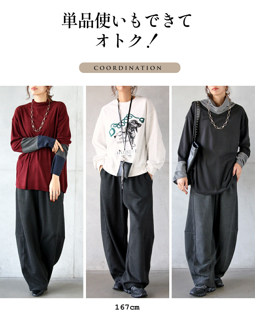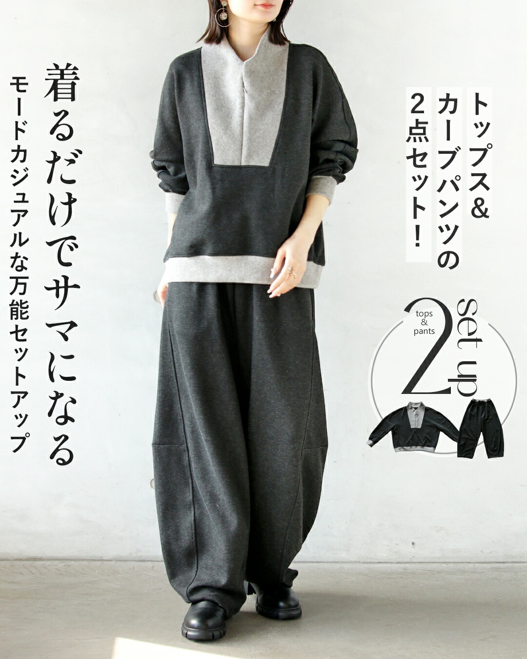 単品使いでもモードカジュアルにコーデが決まる着回し力抜群のセットです。