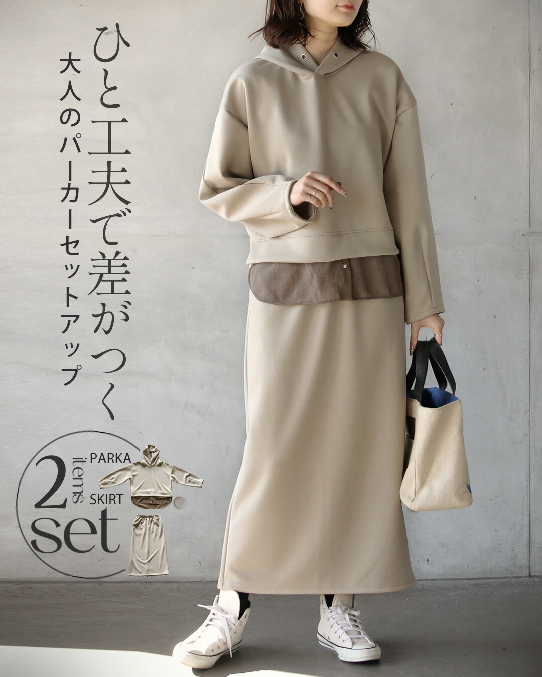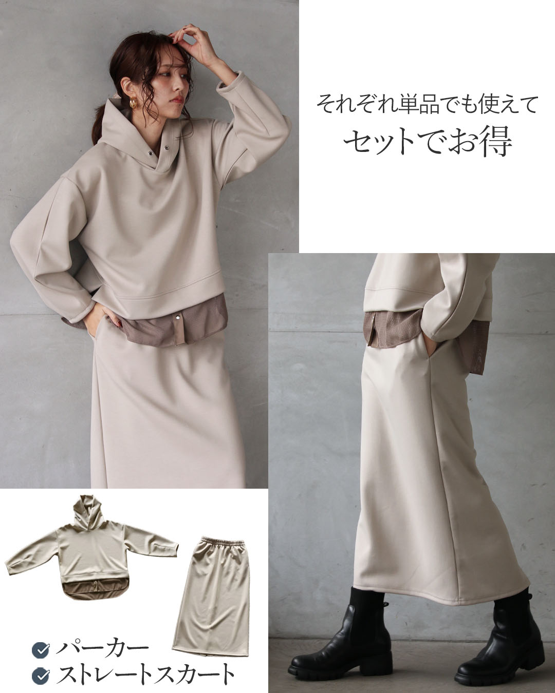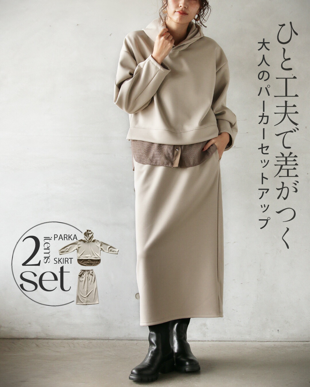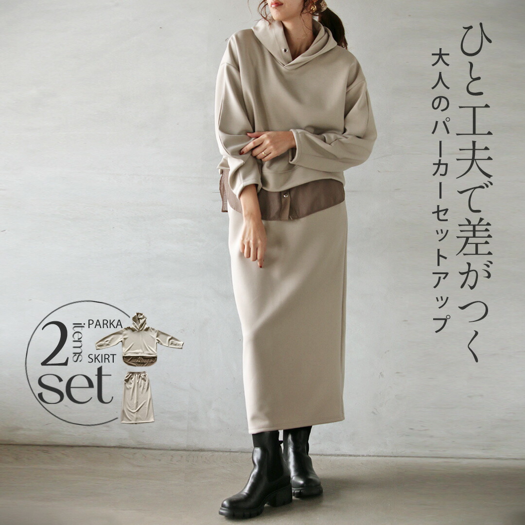 一見ベーシックに見えて、ディテールで差をつけたパーカー×ストレースカートのセットアップ。