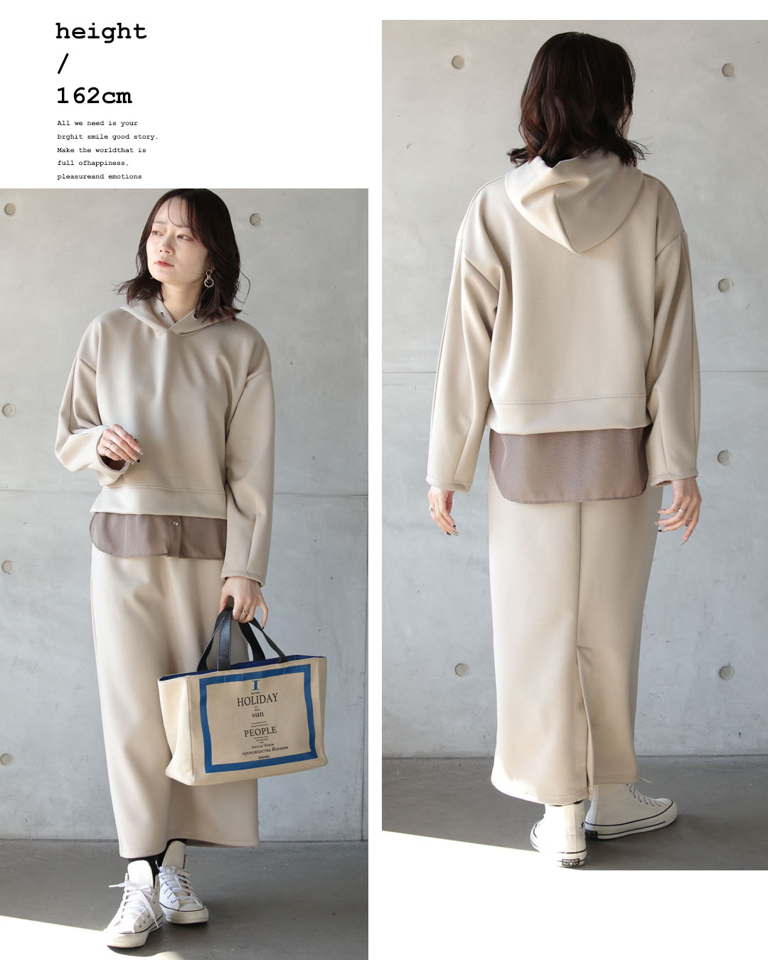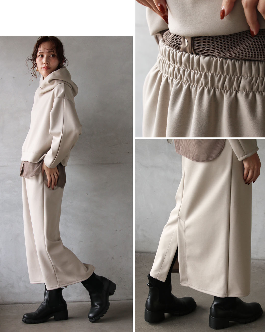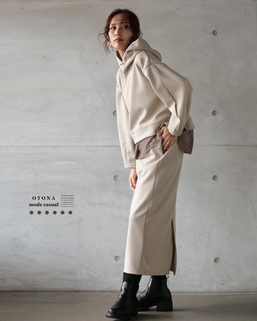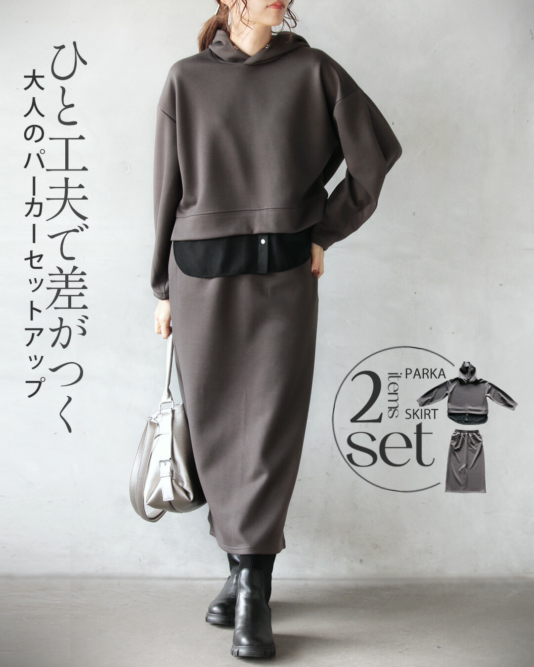一見ベーシックに見えて、ディテールで差をつけたパーカー×ストレースカートのセットアップ。