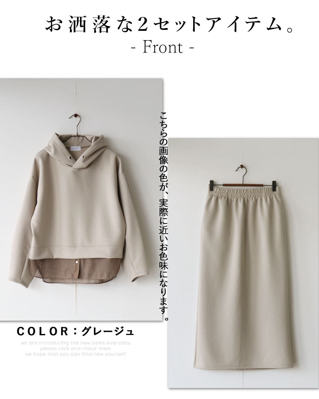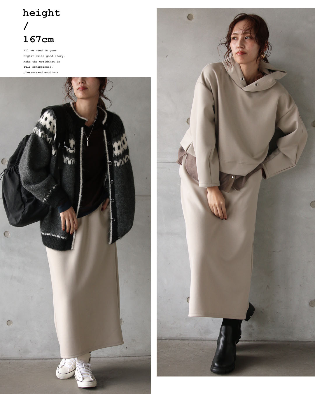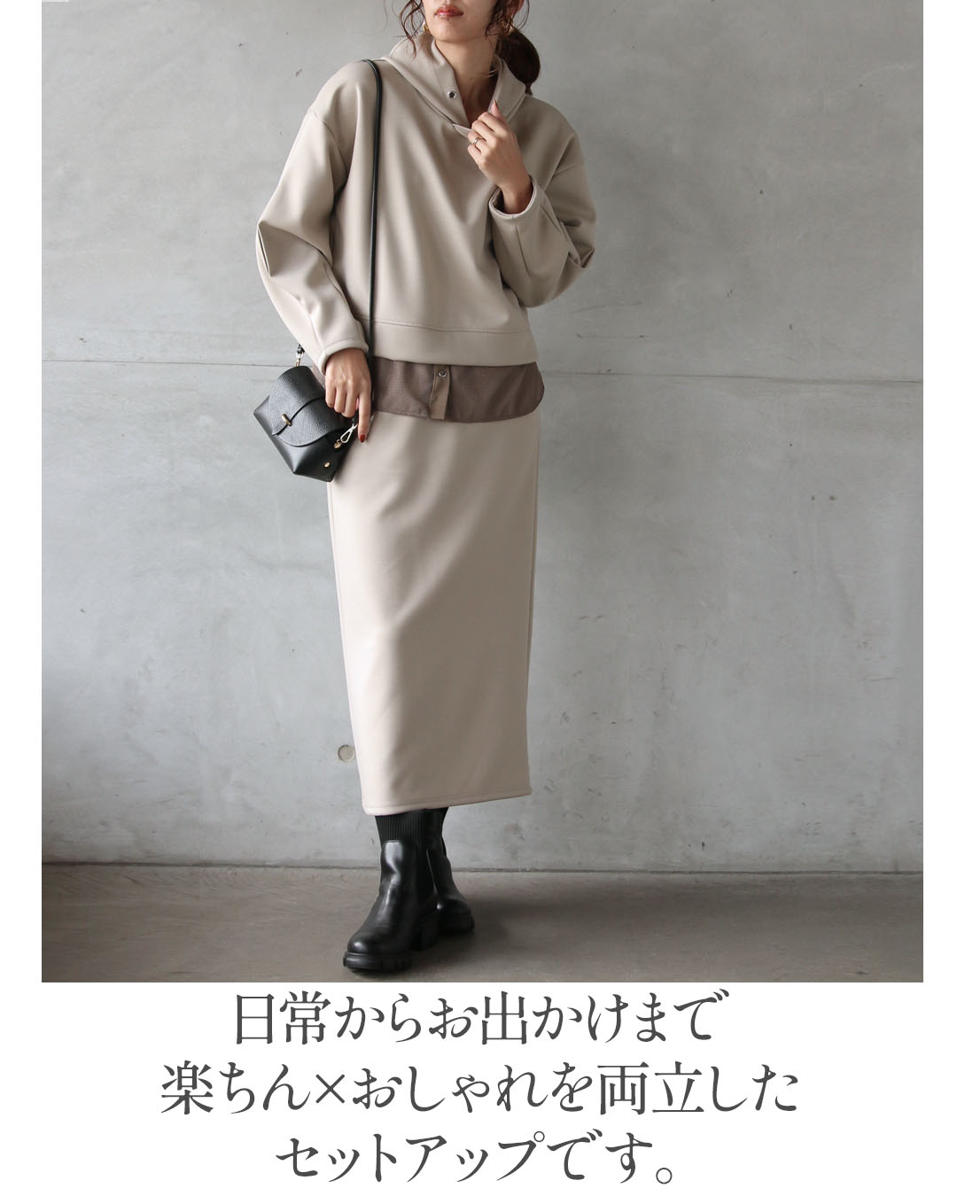 スカートはストーレートなシルエットで縦ラインを強調し、セットで着るだけでスタイルが完成するバランスに仕上げました。