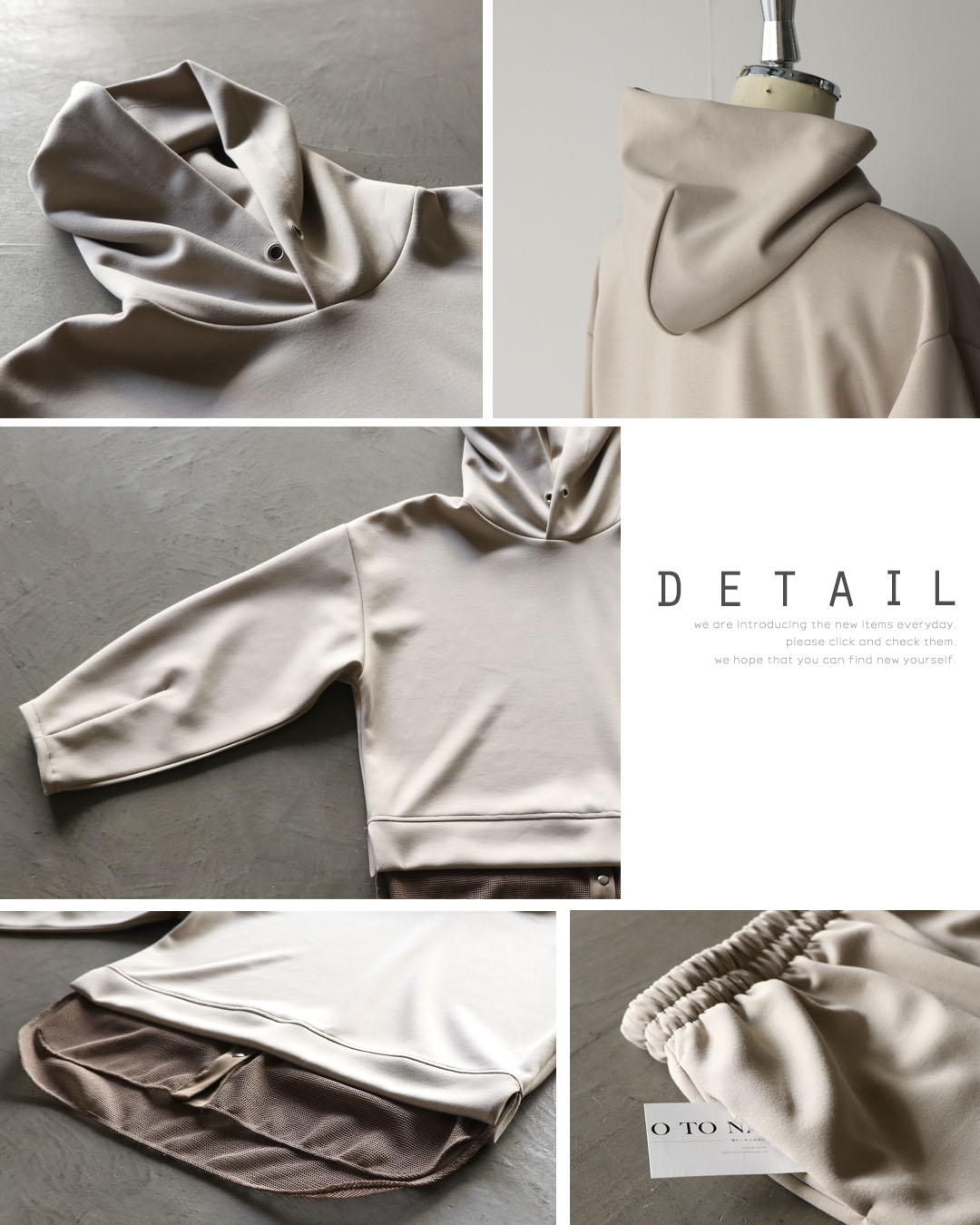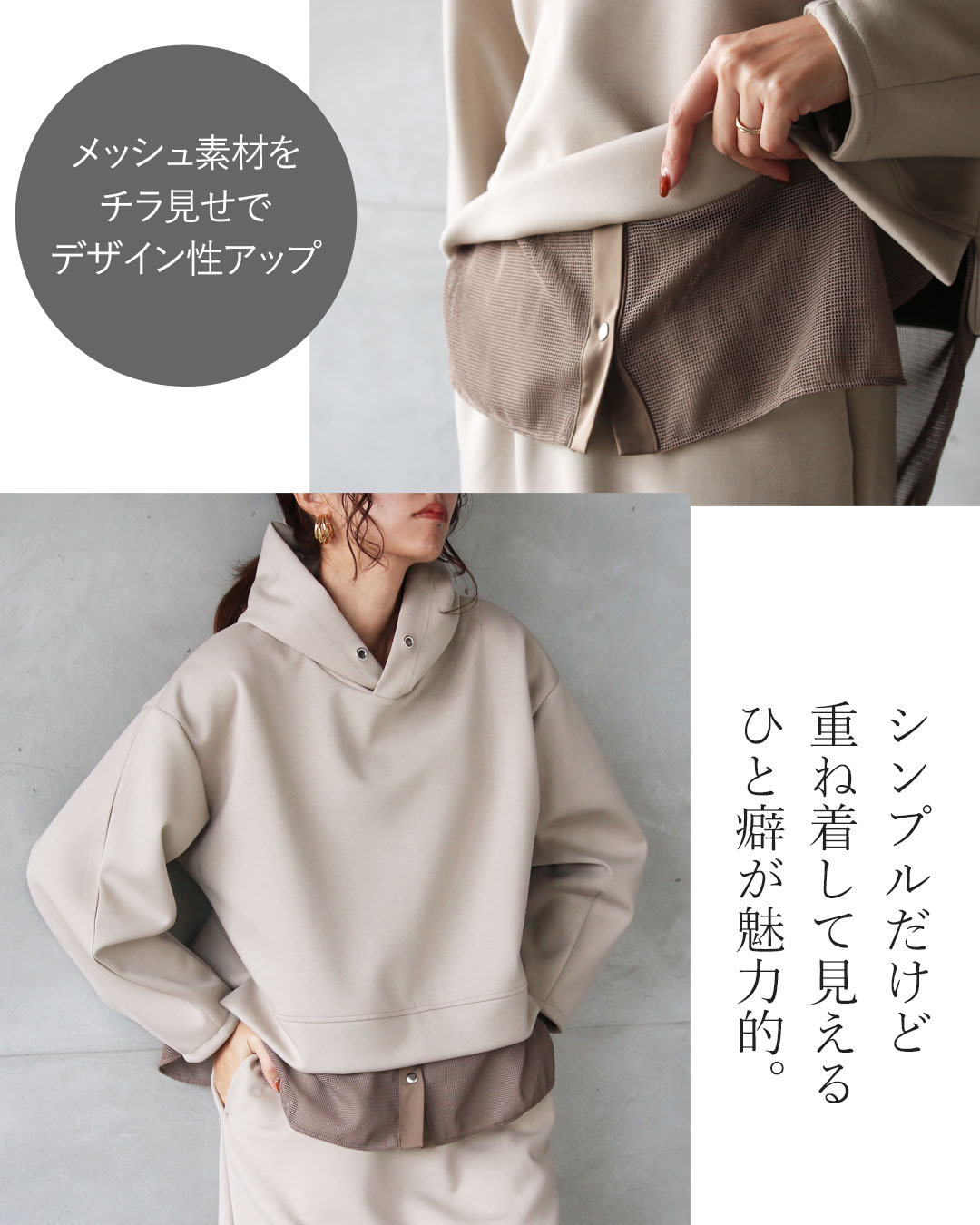 パーカーは、裾にメッシュ生地の切替デザインを施した、ひと味違うデザイン。メッシュ部分にはボタン付きで、開けることでスリット風のアレンジも楽しめます。