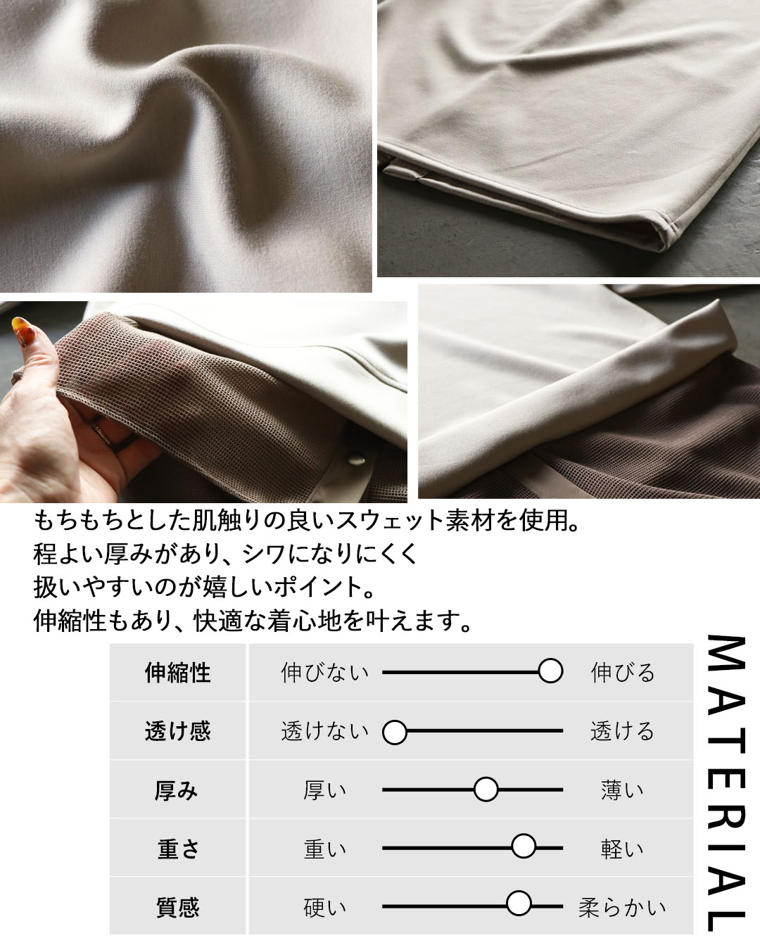 もちもちとした肌触りの良い素材を使用。程よい厚みがあり、シワになりにくく扱いやすいのが嬉しいポイント。伸縮性もあり、快適な着心地を叶えます。
