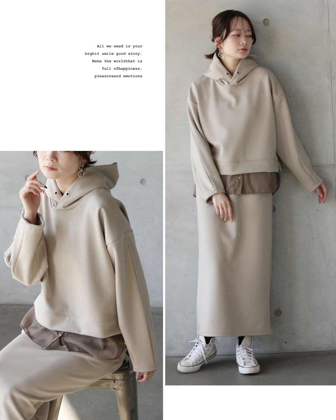 それぞれ単品使いもおすすめ。パーカーはデニムやスラックスと、スカートはシンプルなニットやカットソーと合わせても◎。