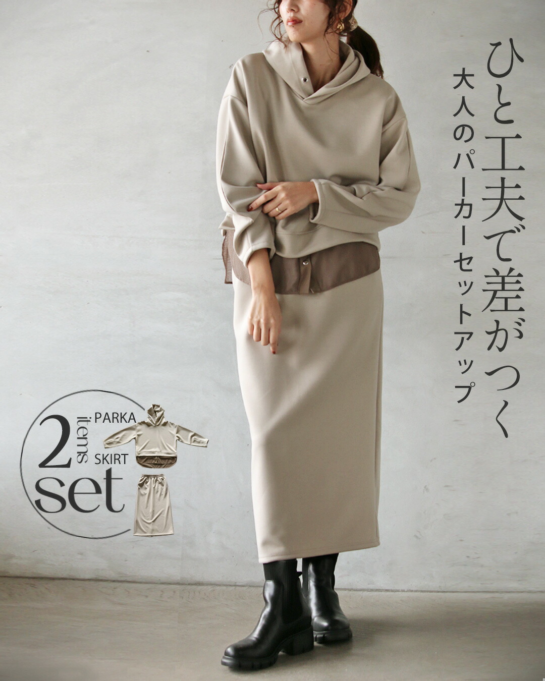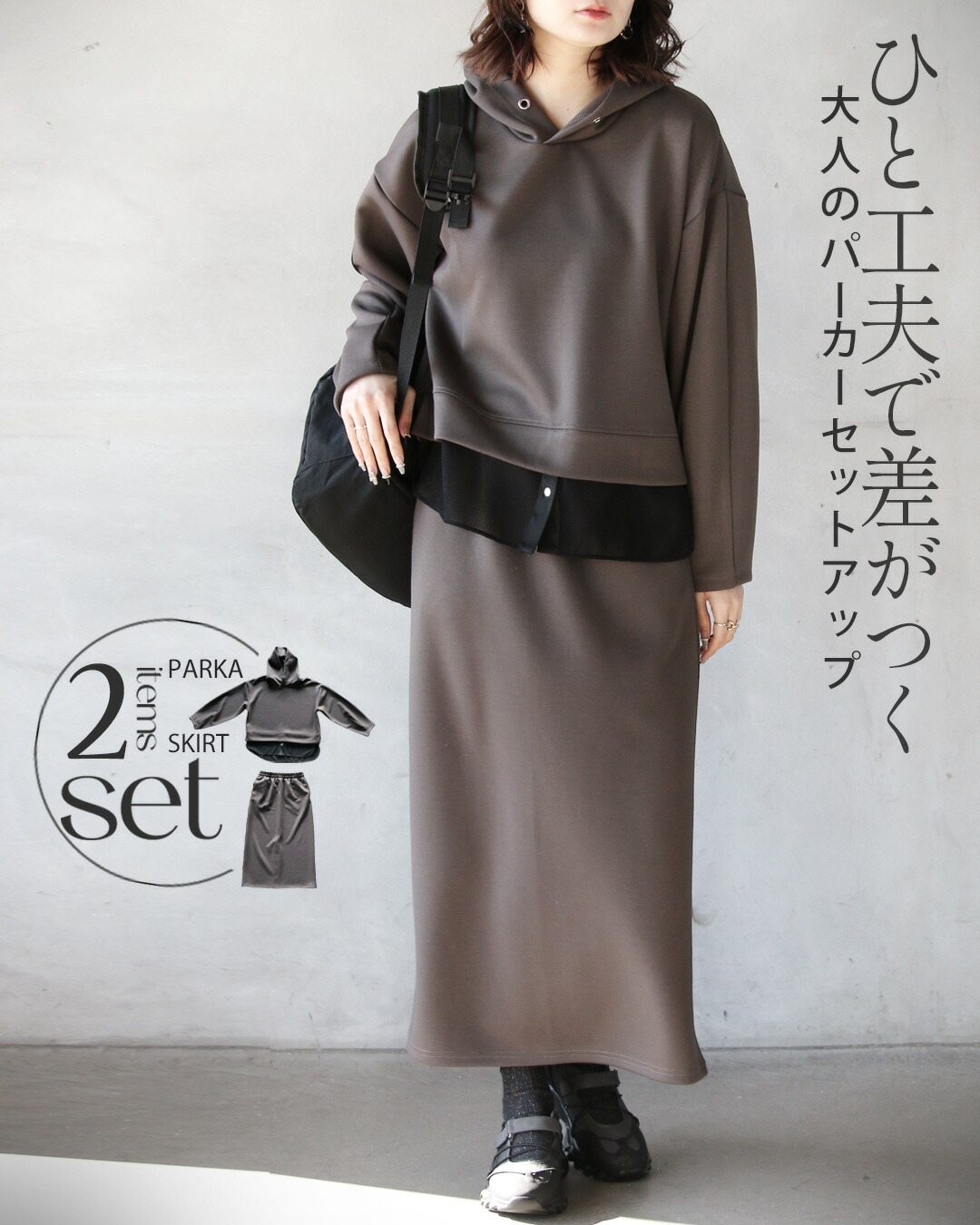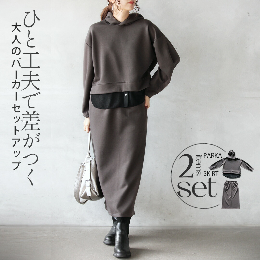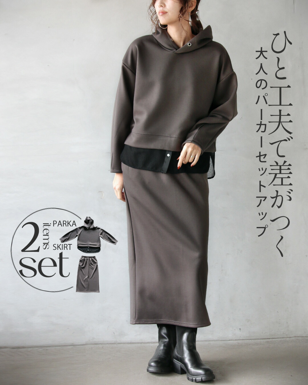 一見ベーシックに見えて、ディテールで差をつけたパーカー×ストレースカートのセットアップ。