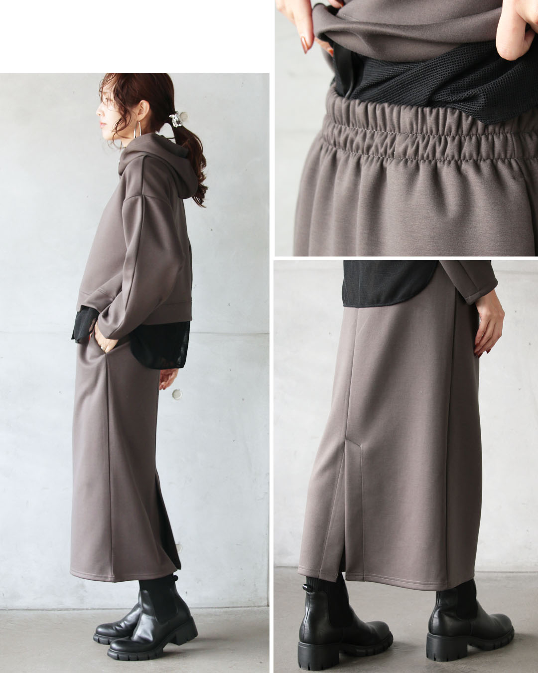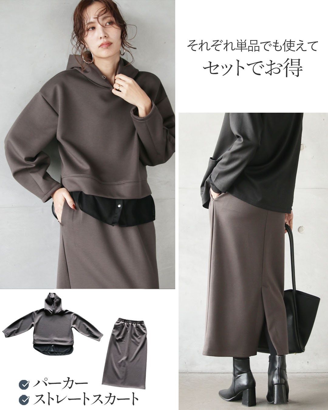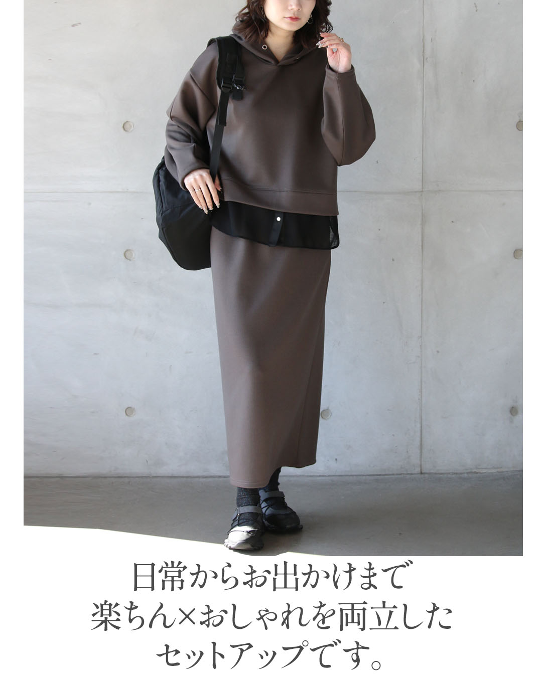 一見ベーシックに見えて、ディテールで差をつけたパーカー×ストレースカートのセットアップ。
