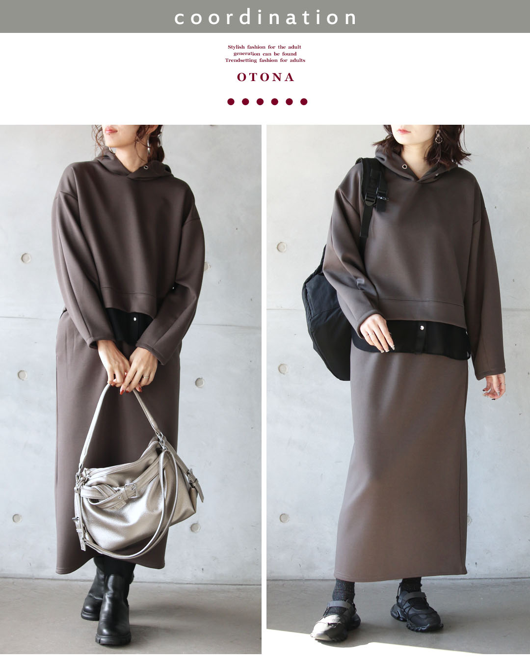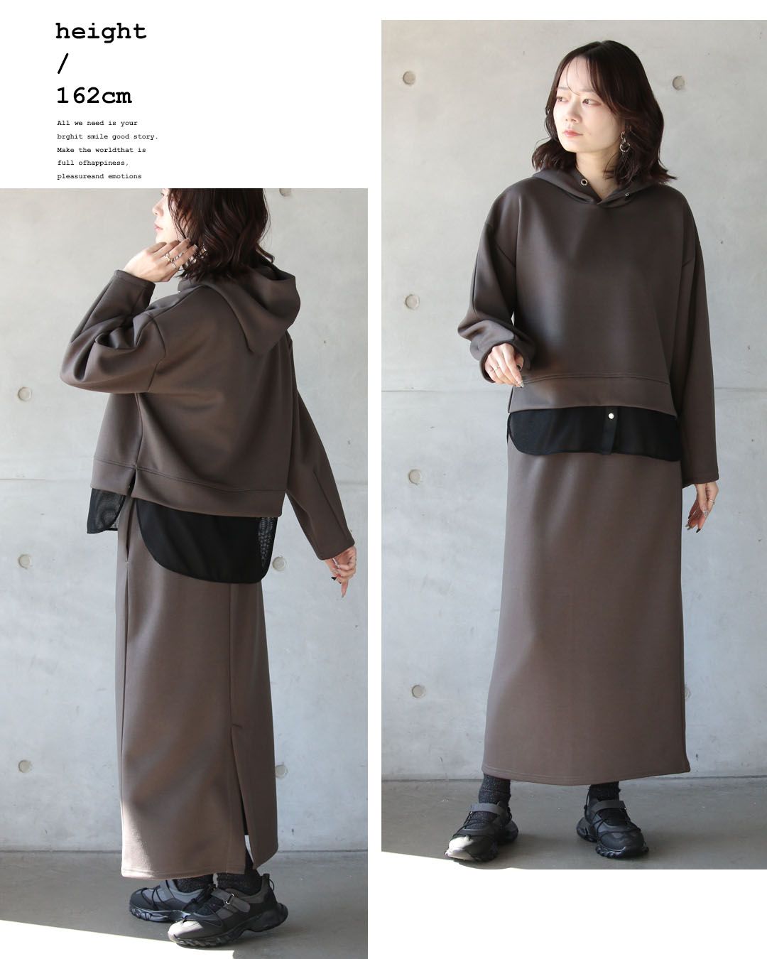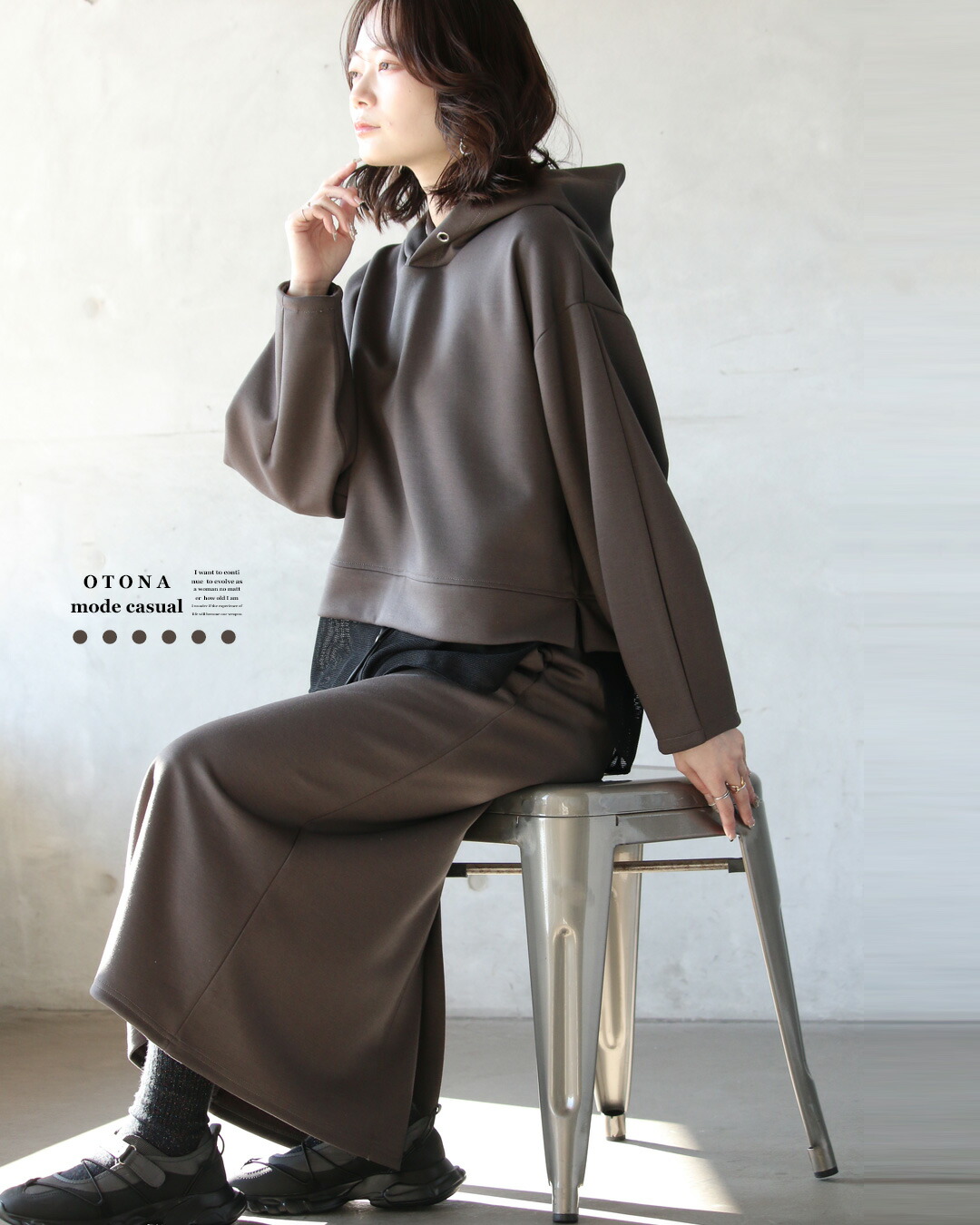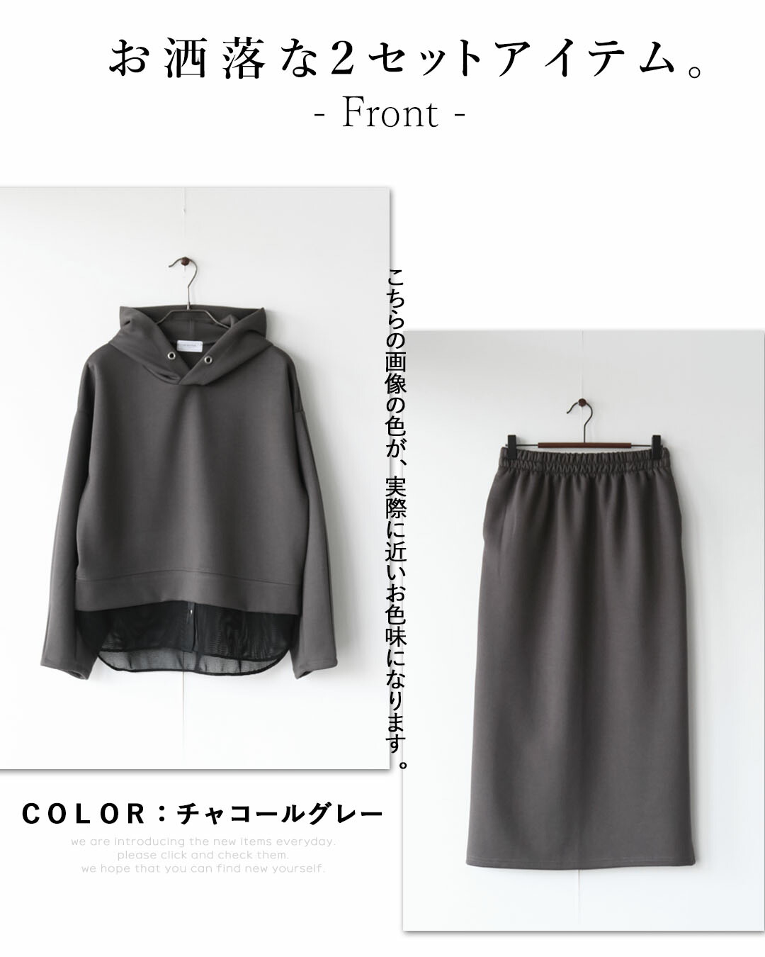 一見ベーシックに見えて、ディテールで差をつけたパーカー×ストレースカートのセットアップ。