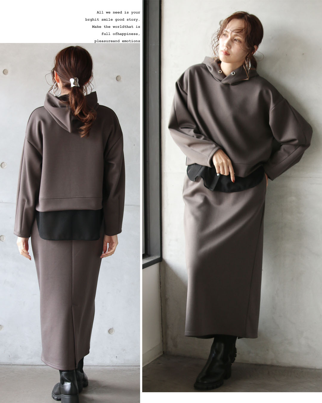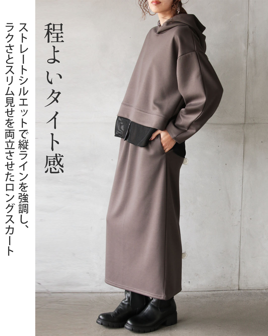 スカートはストーレートなシルエットで縦ラインを強調し、セットで着るだけでスタイルが完成するバランスに仕上げました。