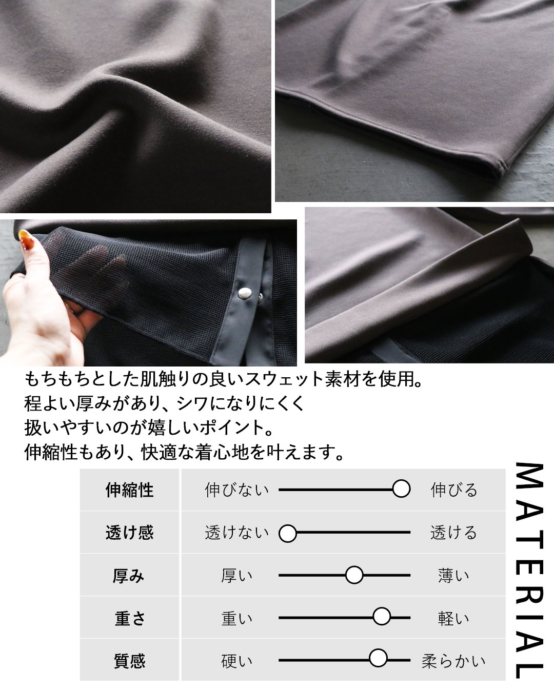 もちもちとした肌触りの良い素材を使用。程よい厚みがあり、シワになりにくく扱いやすいのが嬉しいポイント。伸縮性もあり、快適な着心地を叶えます。