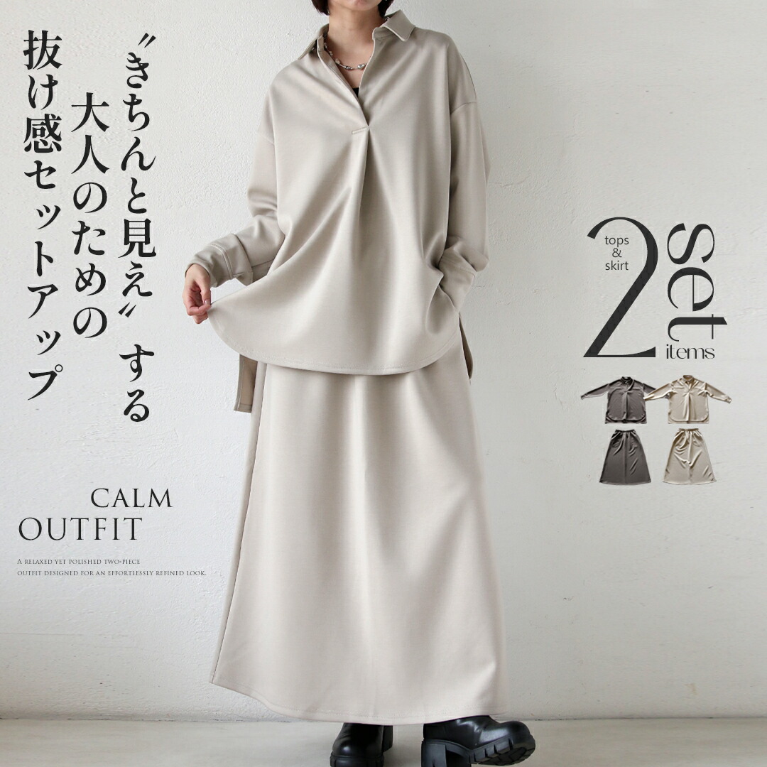 全体的にゆったり着られるオーバーサイズデザインで、長時間着てもストレスフリー。締め付け感がなく、動きやすさも抜群です。トップスはヒップが隠れる安心丈、スカートはAラインで体型を選ばず、幅広い方にフィットします。