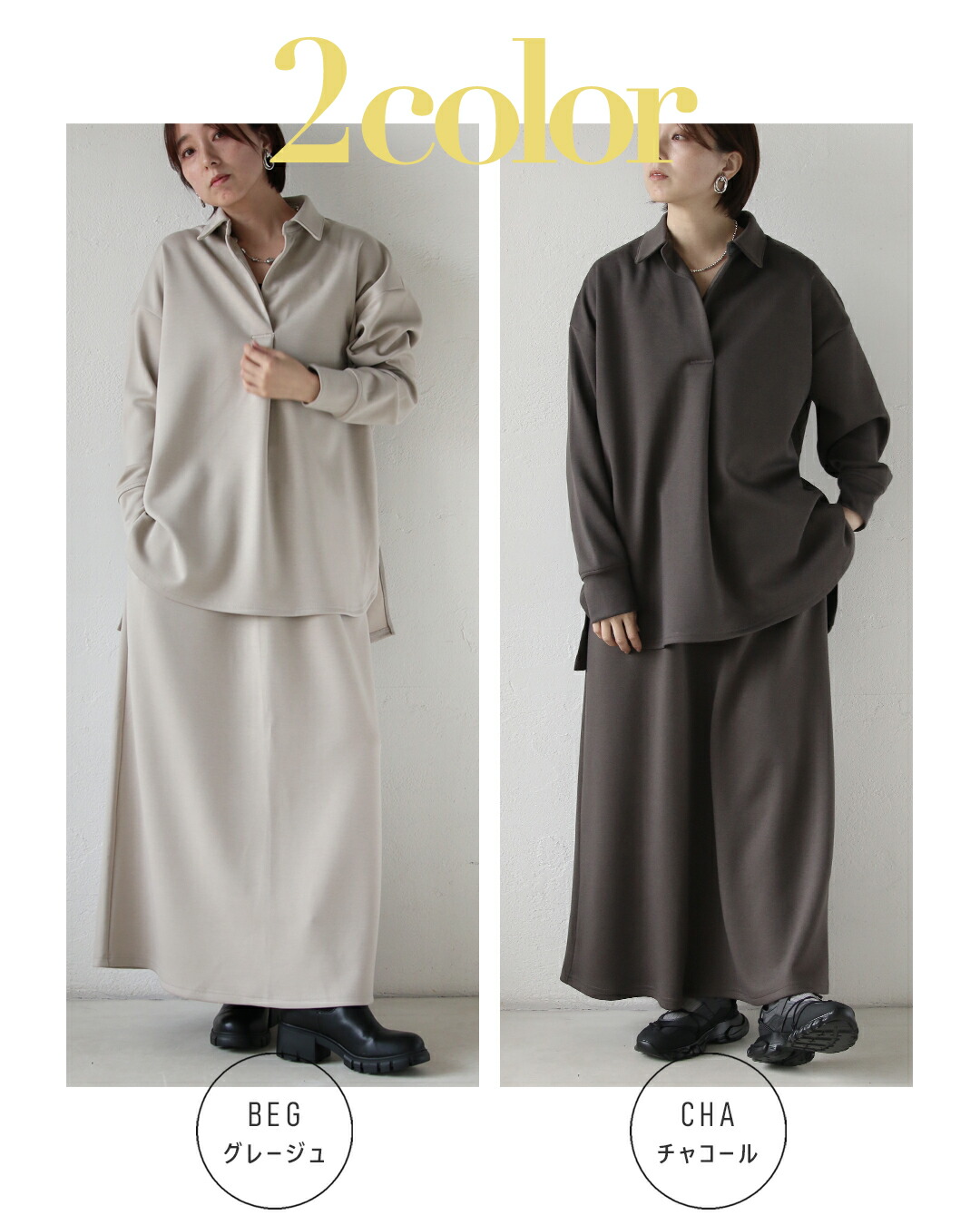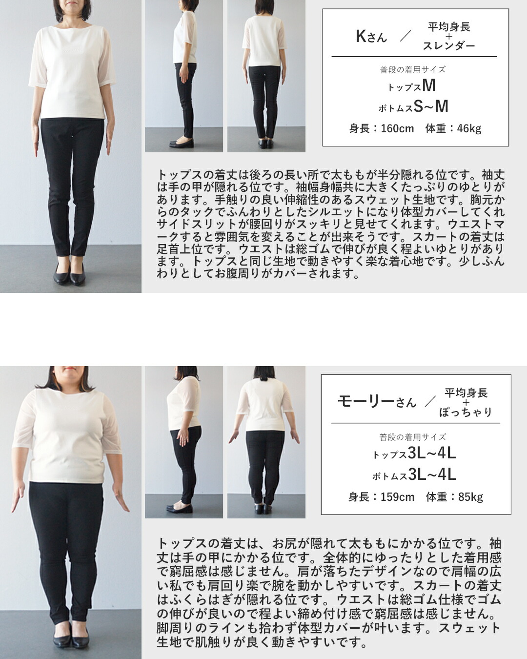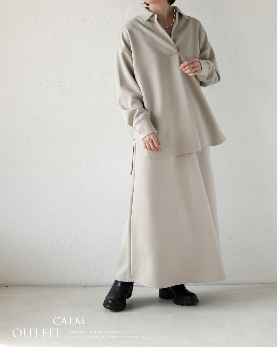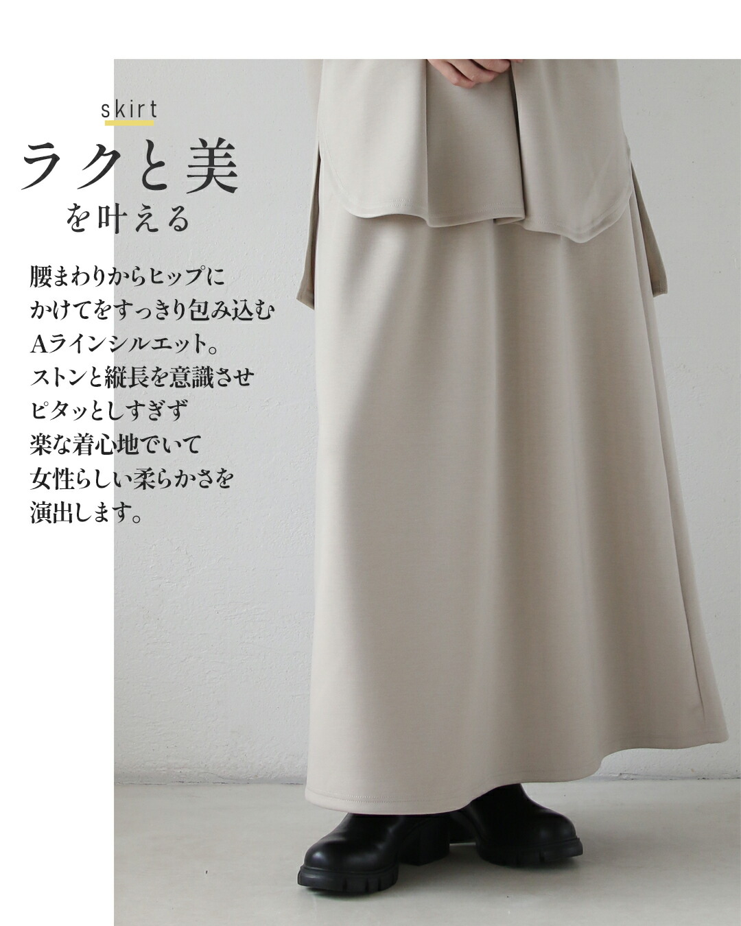 トップスは後ろ丈をやや長め設計で気になるヒップラインを自然にカバー。スカートはAラインシルエットで、腰まわりからヒップにかけてをすっきり包み込み、女性らしい柔らかさを演出します。