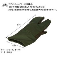 難燃加工と撥水加工を施した「takibi hamp」。手の甲側はtakibi hamp、手のひら側は牛革スエードを使用し耐熱性とグリップ性を実現。焚き火の動作を考慮し、トリガーフィンガー仕様。親指は手のひら側に向け縫製し、ミトンにはない動作性と掴みやすさを追求。スリットを採用することで薪をくべる、火ばさみを掴む等の動作をストレスのない動作性を実現。裾部分を長めにすることで手首や袖を火の粉からガード。サイドのループを使用し、両手をまとめてハンギングが可能。