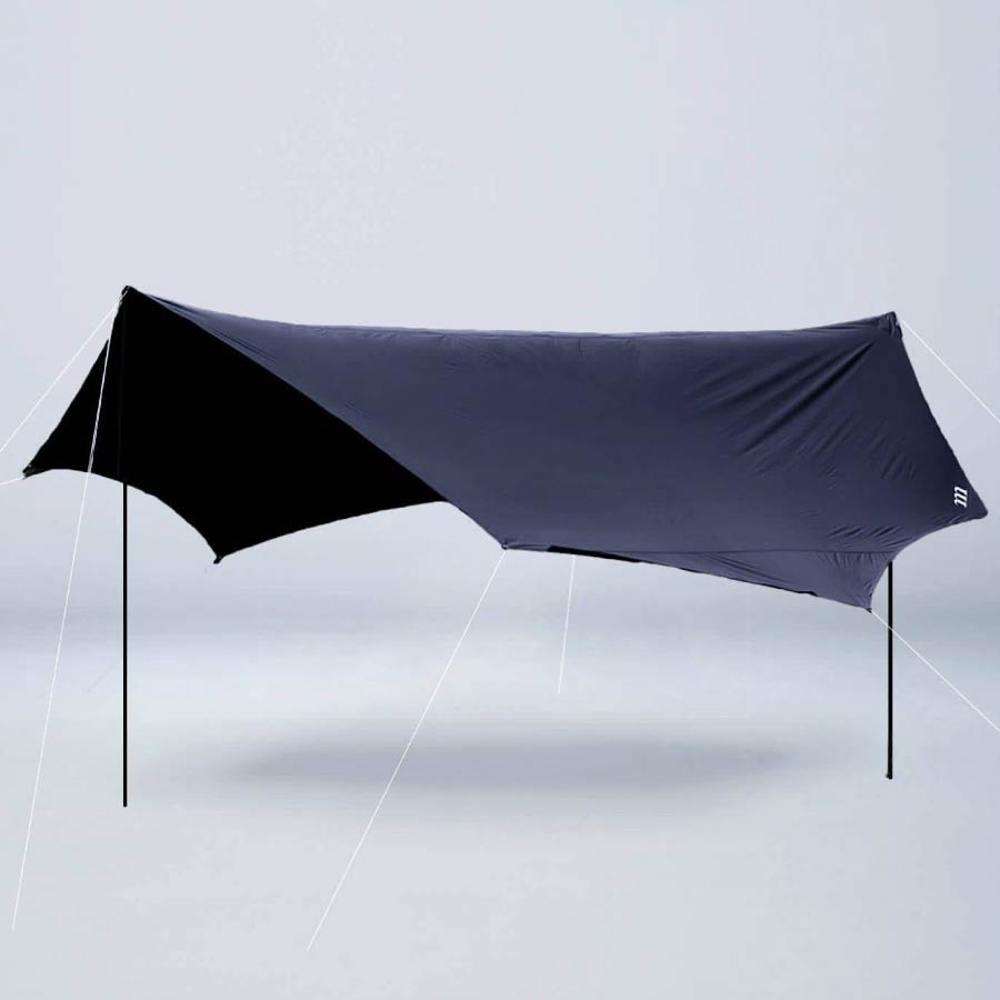 遮光性と排水性に優れたアシンメトリー形状のタープです。生地の裏面にブラックカラーのPUコーティングを施すことで光の透過を極限まで抑え、濃い影を作り出します。フチには雨どいが付いているので、コーナー部分から雨をスムーズに排出できます。左右非対称の形状により、テントに連結させた設営に適しています。様々な気候・地形でテントと組み合わせて最適な形状を作り出すことができます。2?4人に適したサイズです。