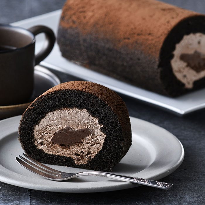 外側のブラックココア生地はふんわり、内側のガナッシュクリームはしっとり。中にはクーベルチュールチョコレートのチップが潜み、パリパリと軽快なアクセント。食感のバランスといい、少し利かせたラム酒といい、なんとも絶妙な大人のためのロールケーキだ。