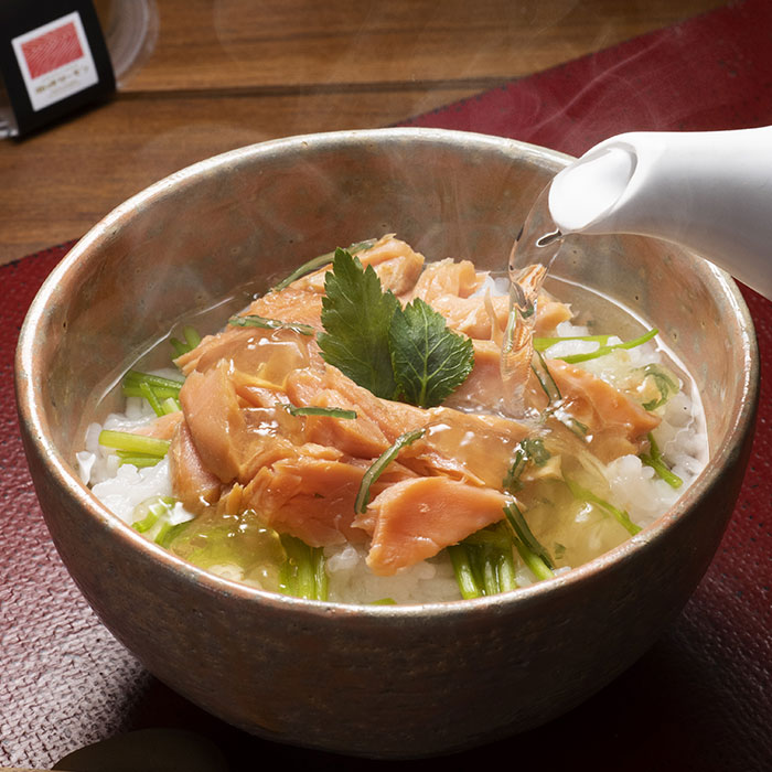 海峡サーモンをそれぞれ味付けし、粗めの焼きほぐしにし、ゼラチン入りのだし汁で閉じ込めました。ご家庭で、ちょっぴり贅沢な海峡サーモンの本格茶漬けを召し上がれます。