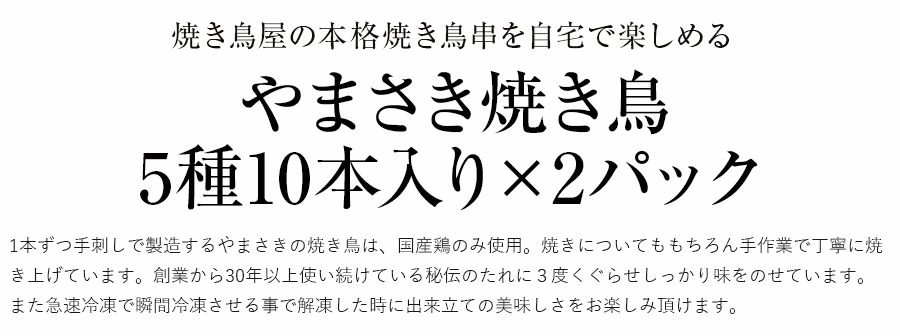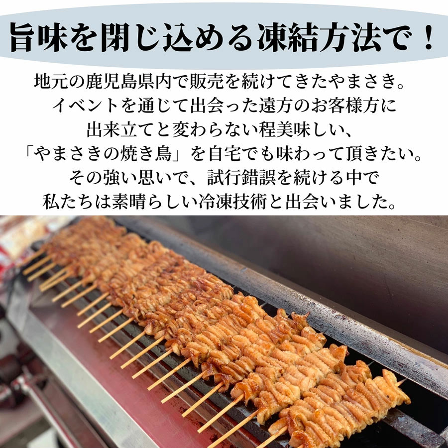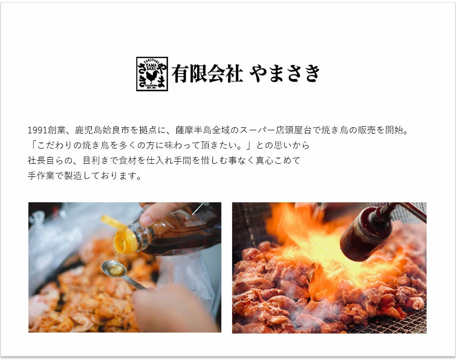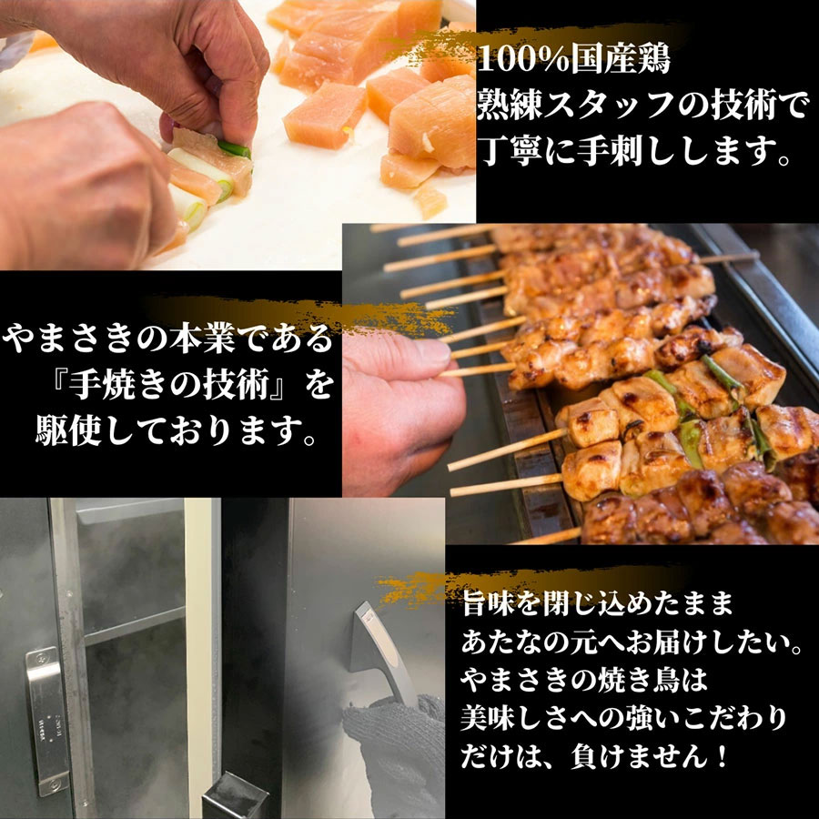 1本ずつ手刺しで製造するやまさきの焼き鳥は、国産鶏のみ使用。焼きについてももちろん手作業で丁寧に焼き上げています。創業から30年以上使い続けている秘伝のたれに3度くぐらせしっかり味をのせています。また急速冷凍で瞬間冷凍させる事で解凍した時に出来立ての美味しさをお楽しみ頂けます。