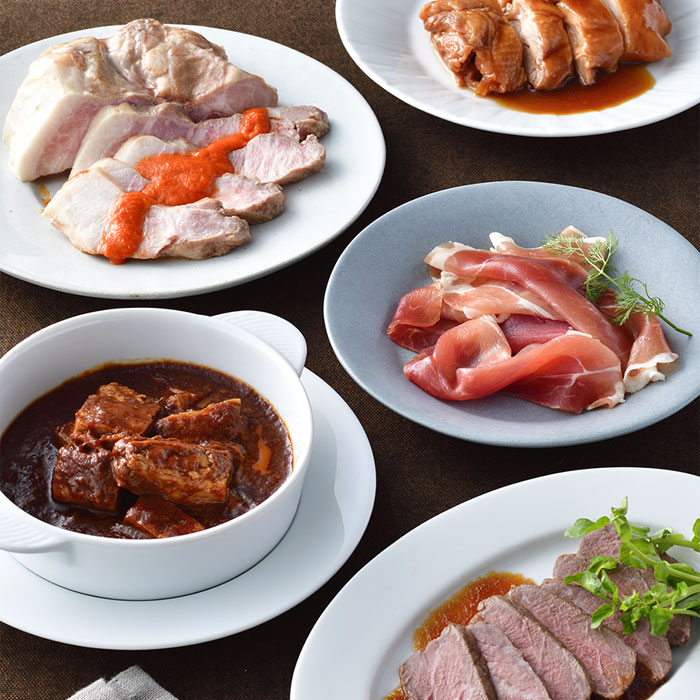 ローストポーク、氷温熟成ローストビーフ、ビーフシチュー、神戸ポーク生ハム、照り焼きチキンの5種類をセットしました。親しい友人や家族とお家の食卓で肉バル気分をワインと一緒にお楽しみください。