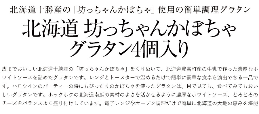 皮までおいしい北海道十勝産の「坊っちゃんかぼちゃ」をくりぬいて、北海道豊富町産の牛乳で作った濃厚なホワイトソースを詰めたグラタンです。レンジとトースターで温めるだけで簡単に豪華な食卓を演出できる一品です。ハロウインのパーティーの時にもぴったりのかぼちゃを使ったグラタンは、目で見ても、食べてみてもおいしいグラタンです。ホックホクの北海道南瓜の素材のよさを活かせるように濃厚なホワイトソース、とろとろのチーズをバランスよく盛り付けしています。電子レンジやオーブン調理だけで簡単に北海道の大地の恵みを堪能できます。