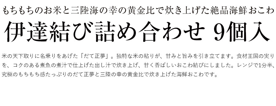 米の天下取りに名乗りをあげた「だて正夢」。独特な米の粘りが、甘みと旨みを引き立てます。食材王国の実りを、コクのある煮魚の煮汁で仕上げた出し汁で炊き上げ、甘く香ばしいおこわ結びにしました。レンジで1分半、究極のもちもち感たっぷりのだて正夢と三陸の幸の黄金比で炊き上げた海鮮おこわです。