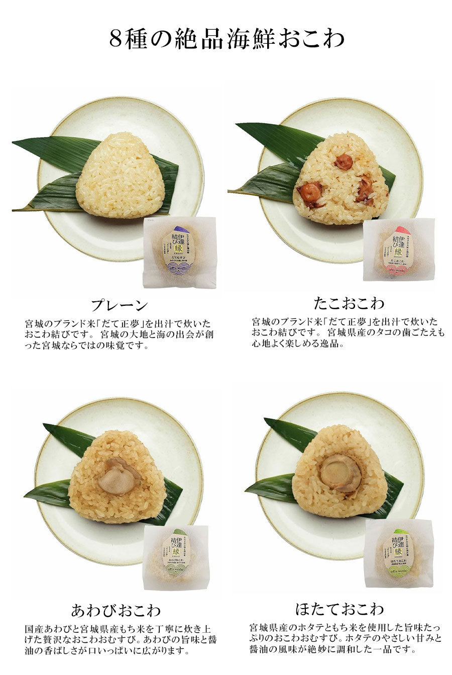 【伊達結びあわび(だてむすびあわび)】うるち米(宮城県産)、もち米(宮城県産)、あわび(国産)、しょうゆ、還元水飴、砂糖、水あめ、清酒、米発酵調味料、食塩、醸造酢、(一部に小麦・大豆を含む)