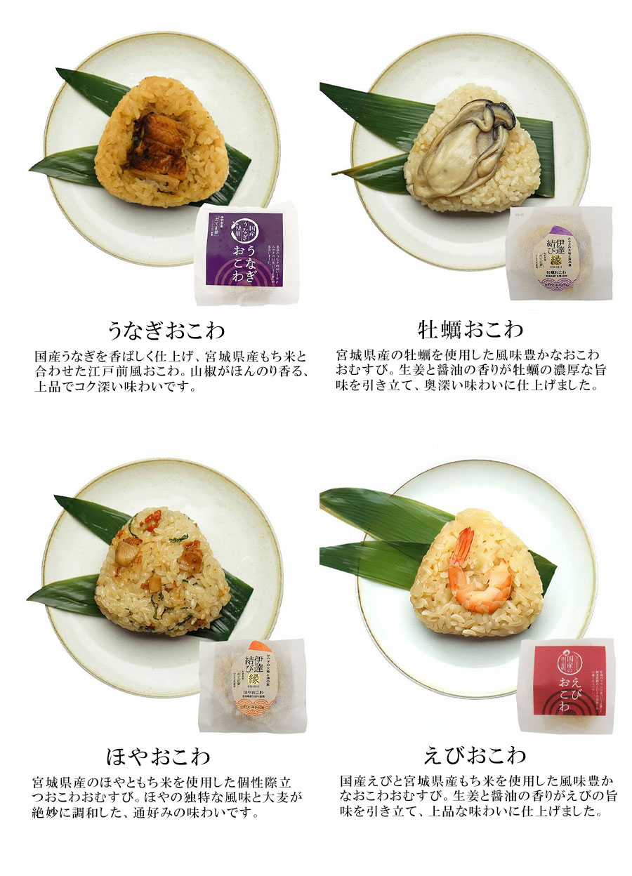 【伊達結びほや(だてむすびほや)】うるち米(宮城県産)、もち米(宮城県産)、ほや(宮城県産)、大麦、しょうゆ、還元水飴、砂糖、水あめ、清酒、米発酵調味料、醸造酢、酵母エキス、食塩、(一部に小麦・大豆を含む)