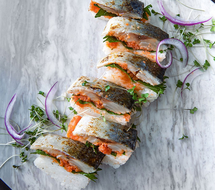 国産の脂ののった厳選真さばを炙り、上質な明太子を贅沢に合わせました。 皮目を炙ることにより香ばしい香りとさばの旨み、明太子と大葉のアクセントが印象的な、まさに福岡名物ともいえる逸品です。