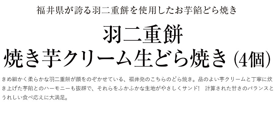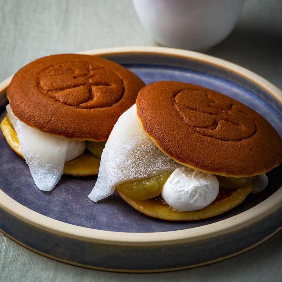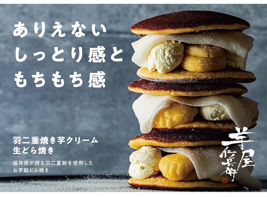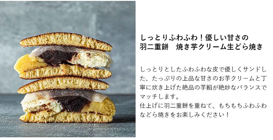 きめ細かく柔らかな羽二重餅が顔をのぞかせている、福井発のこちらのどら焼き。品のよい芋クリームと丁寧に炊き上げた芋餡とのハーモニーも抜群で、それらをふかふかな生地がやさしくサンド! 計算された甘さのバランスとうれしい食べ応えに大満足。