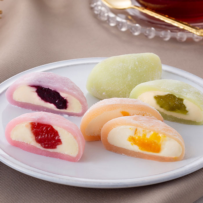 国産シャインマスカット、福岡県産あまおう苺、マンゴー、ブルーベリーのジャムをオーストラリア産クリームチーズと北海道産マスカルポーネチーズを使用したクリームで閉じ込め、甘さ控えめの滑らかな食感のもちもち大福生地で包みました。