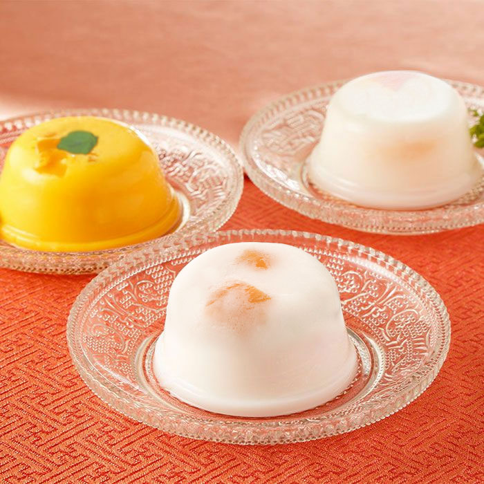 ももとクコの実が入ったなめらかな食感の杏仁豆腐は、杏仁霜の香りがほどよくきいています。マンゴープリンはピューレと果肉を使用しており、繊維質な果肉が生み出す濃厚でまろやかな味わいの中華で人気のフルーツスイーツに仕上げました。ライチプリンはライチの果実が入っており、まろやかでさっぱりとした味わいのデザート。冷蔵庫でよく冷やしてお召し上がりください。