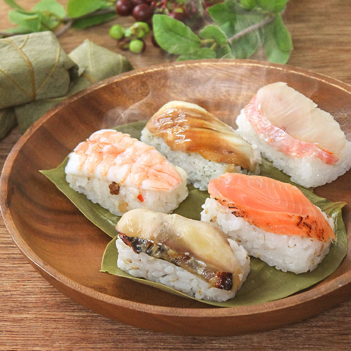 ○内容量:柿の葉寿司蒸し寿司(焼さば・えび・穴子・炙りさけ・金目鯛)×各2個 合計10個入