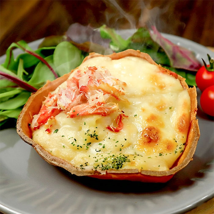 かに型の可食容器を使用した、器(甲羅)ごと食べれるかにグラタンです。従来は食べ終わった後に廃棄物として甲羅を廃棄していましたが、器ごと食べれるので、ほとんど廃棄物がありません。こだわりは器だけでなく、濃厚でクリーミーな本格ホワイトソースとじっくりと炒めた玉ねぎペーストを使用した、贅沢な味わいのグラタンソースを使用しております。また、かに身は「本ズワイガニ」を使用した他には負けない品質とボリュームで差別化したかにグラタンです。