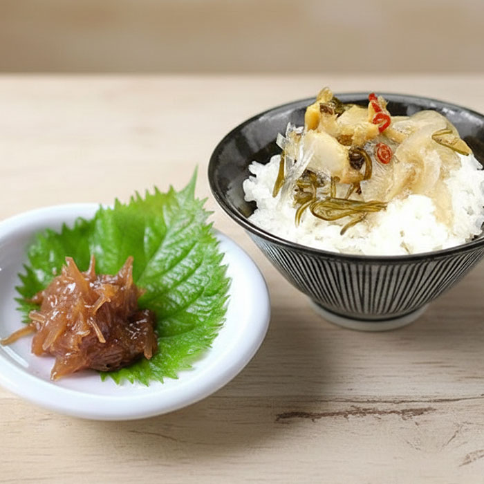 ごはんにも合う梅水晶は、気仙沼産のサメ軟骨と紀州南高梅を辛子と漬け込んだ梅干を使い丁寧に仕上げた梅水晶です。ごはんにも合うように軟骨を短めにスライスカットし、少し甘辛に仕上げております。気仙沼ふかひれ松前漬けはふかひれとサメ軟骨、あわびの贅沢な松前漬けです。ごはんに乗せても、お酒のお供としても、贅沢な風味を存分に楽しめる逸品です。