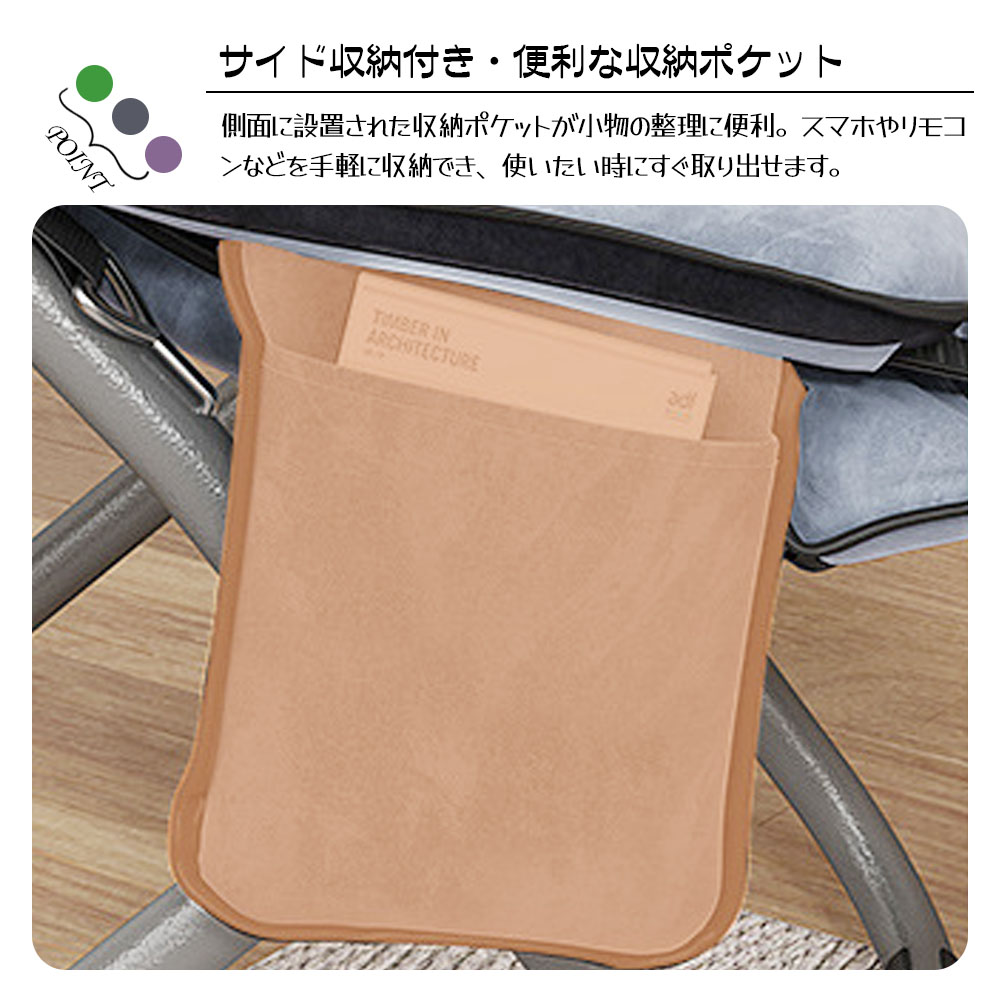 【実用的なサイドポケット付き】椅子の側面に収納ポケットを設け、雑誌やスマホ、リモコンなどを手軽に収納可能。