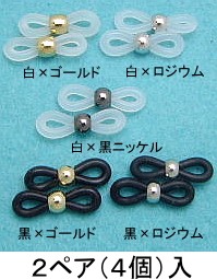 メガネの弦に下げるチェーン(コード)の取り付け用のパーツです。シリコンで出来ているのでメガネの弦を傷つけません。 全長/約19mm 金具部分/直径5mm 金具のカラー/ゴールド、ロジウム、黒ニッケル シリコンの色/白、黒 入り数/2ペア(4個)入