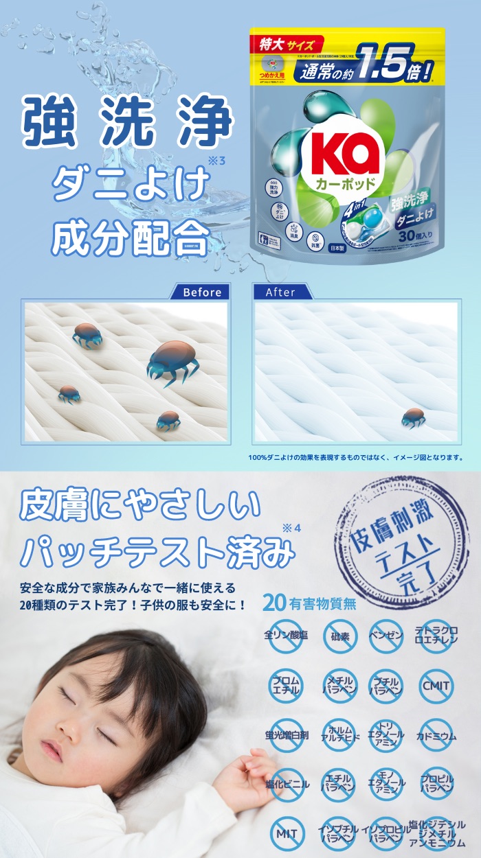ブランド紹介 カーポッドダニよけは、いつものお洗濯で手軽に従来の洗剤でできないダニよけを、独自の技術でよせつけにくい効果をプラスしました。