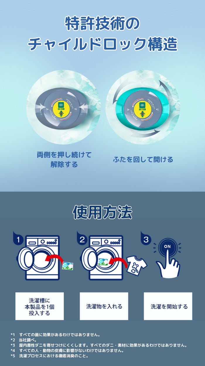 抜群の洗浄力*1、抗菌力*2、消臭*3、柔軟の4つの機能をカプセルに閉じ込めました。