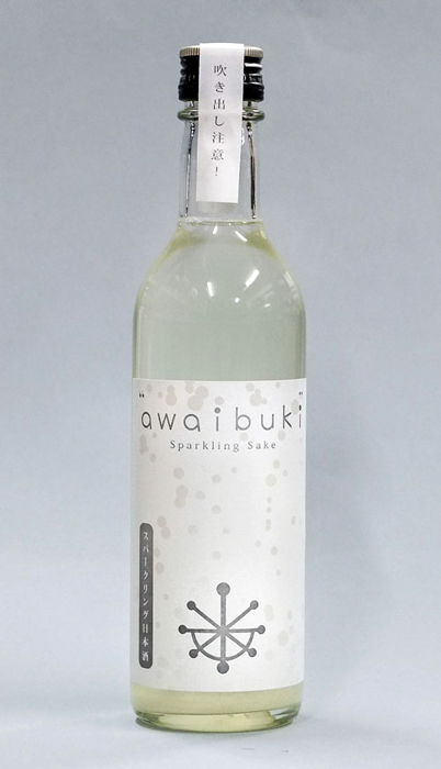 瓶内二次発酵のスパークリング日本酒「awaibuki(あわいぶき)」。低アルコール(7%)の甘酸っぱく、発泡性のあるお酒です。