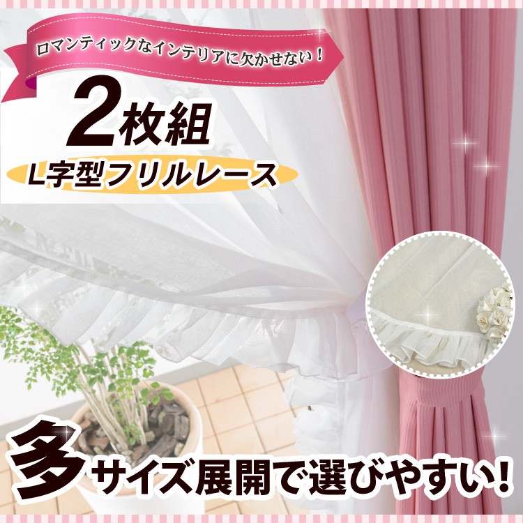 L字型にフリルをトリミング!タッセルにもフリルをたっぷりあしらったロマンティックなレースカーテンです。