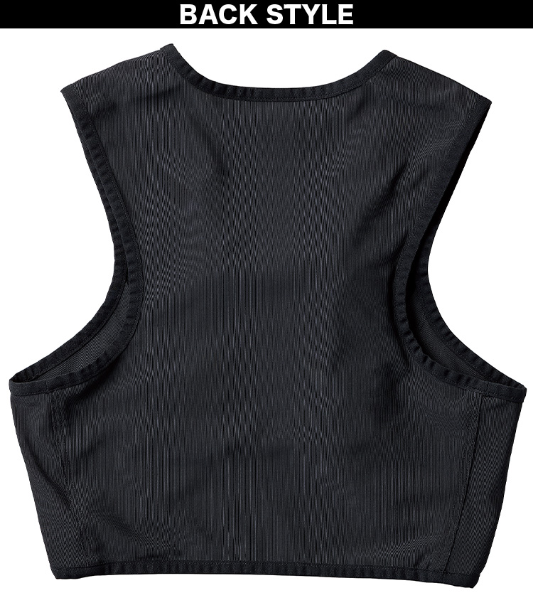 背中と両脇に保冷材用ポケットを装備したメッシュベスト。