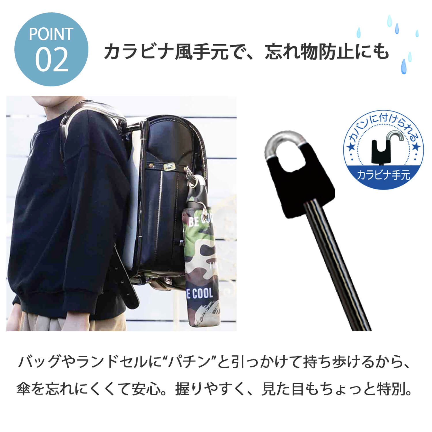 | 商品説明 | 【ランドセルにつけられるカラビナ手元付き!】 ランドセルに簡単取り付け!カラビナ手元付きで持ち運びラクラク。 フックでサッと掛けられるから、通学やお出かけの際も両手が自由に。 傘の置き忘れ防止にもつながる、うれしい機能です。 【見えるから安心。前がクリアな透明窓付き】 前が見やすい透明窓付きで、視界すっきり。顔まわりの一部が透明になっているので、歩くときも安心。 通学や人通りの多い場所でも、前方の視認性をしっかり確保できます。 【キッズもラクに持てる、わずか220gの軽量設計】 たったの220g!キッズも軽々。 小さな手でもしっかり持てる、軽量傘。 毎日持ち歩いても負担にならない、うれしい軽さです。 【スチール×グラスファイバーで、軽くて強い】 軽量なスチールとグラスファイバーを組み合わせた親骨パーツを採用。 スチールの安定感と、グラスファイバーのしなやかさを活かし、 軽さと耐久性を両立した、バランスの取れた構造です。 【こんなシーンで活躍】 ・通園・通学(毎日の送り迎えや登下校) ・遠足や社会科見学の日の雨対策 ・学童・習い事の行き帰り ・雨の日のお買い物や外出 ・祖父母の家や親戚宅へのお泊まり ・突然の雨に備えてランドセルやリュックに常備 ・梅雨時期の備えアイテムとして ・兄弟・姉妹とのお揃いやプレゼントにも ・保育園・幼稚園の置き傘用 ・入園・入学準備の必需品として |