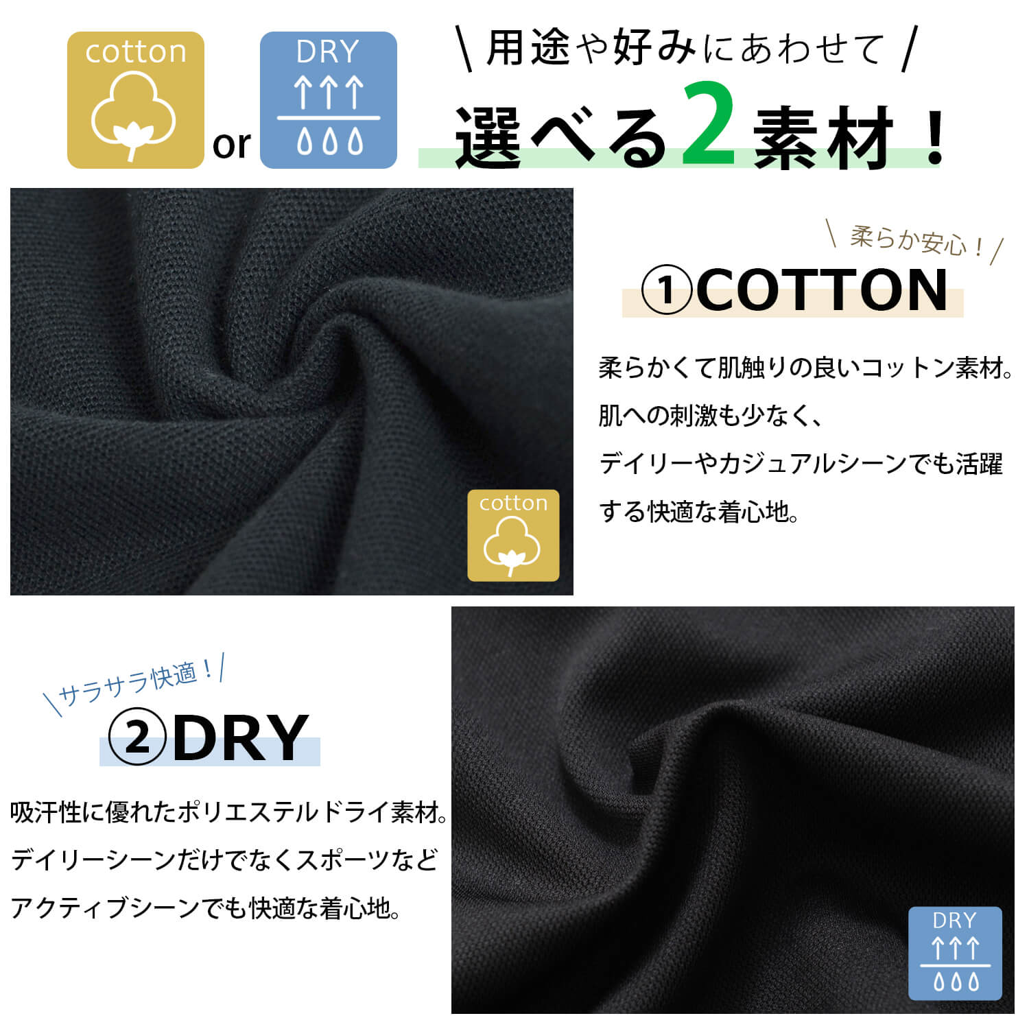 | 素材 | 綿100%/ドライポリエステル100% |