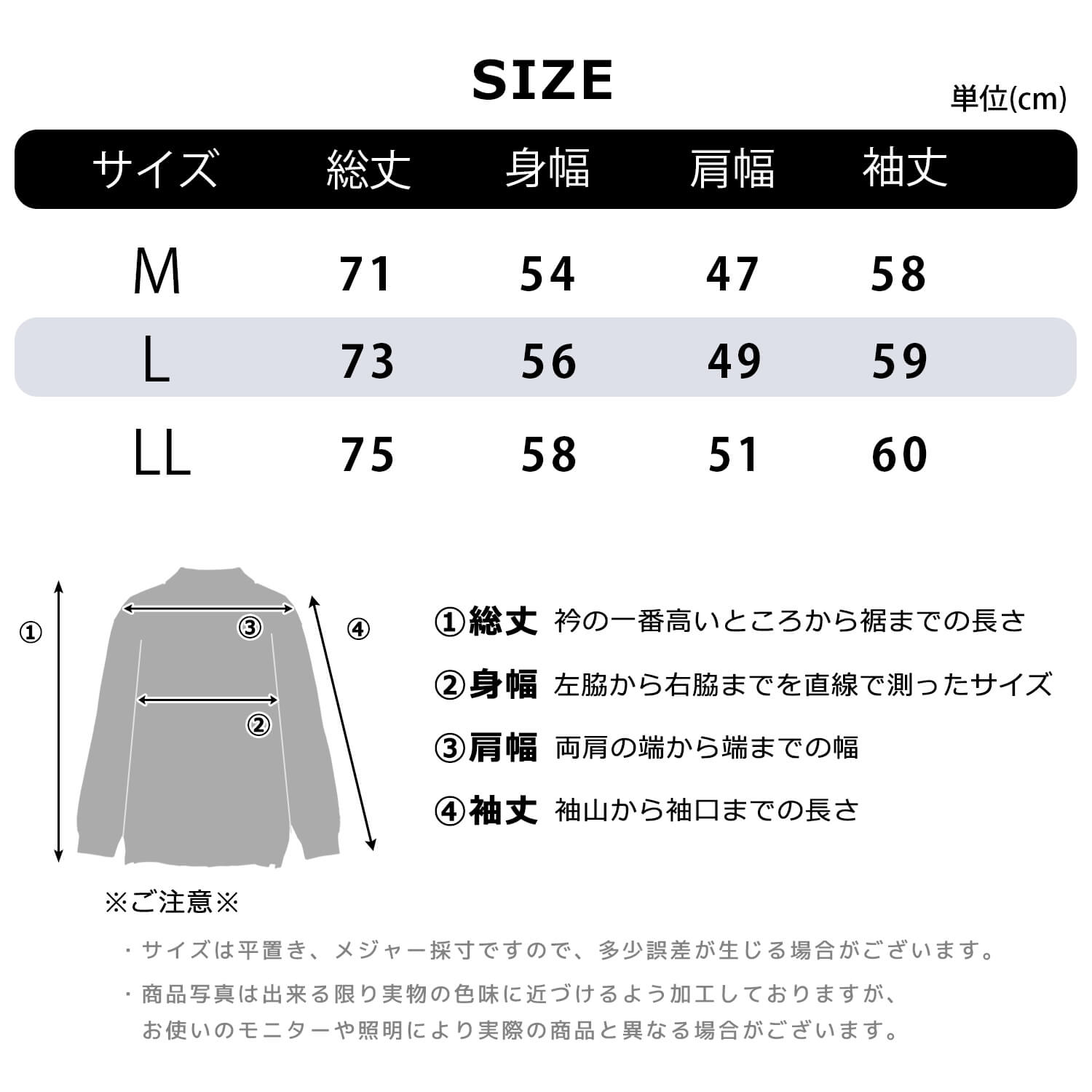 | サイズ(cm) | 総丈 | 身幅 | 肩幅 | そで丈 |