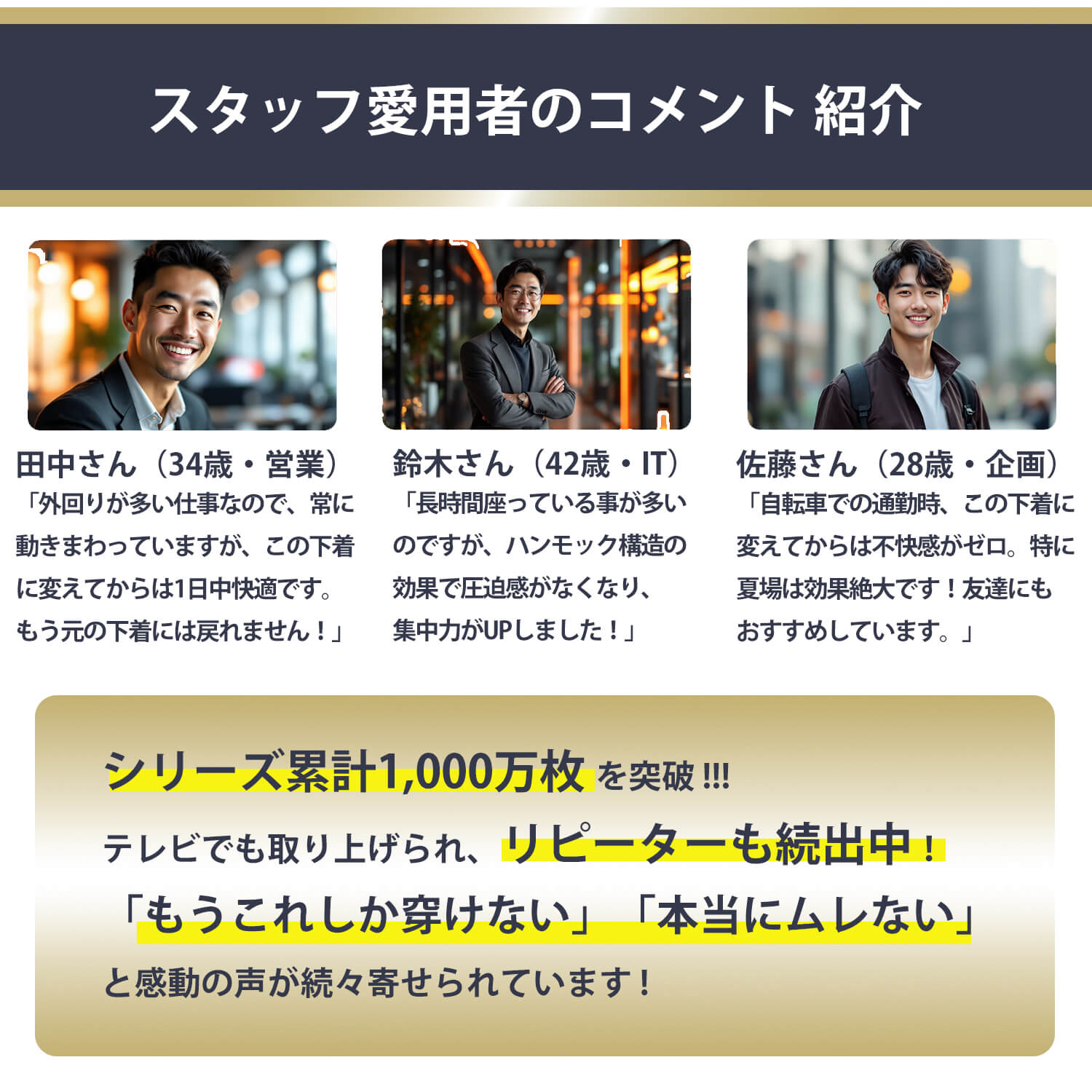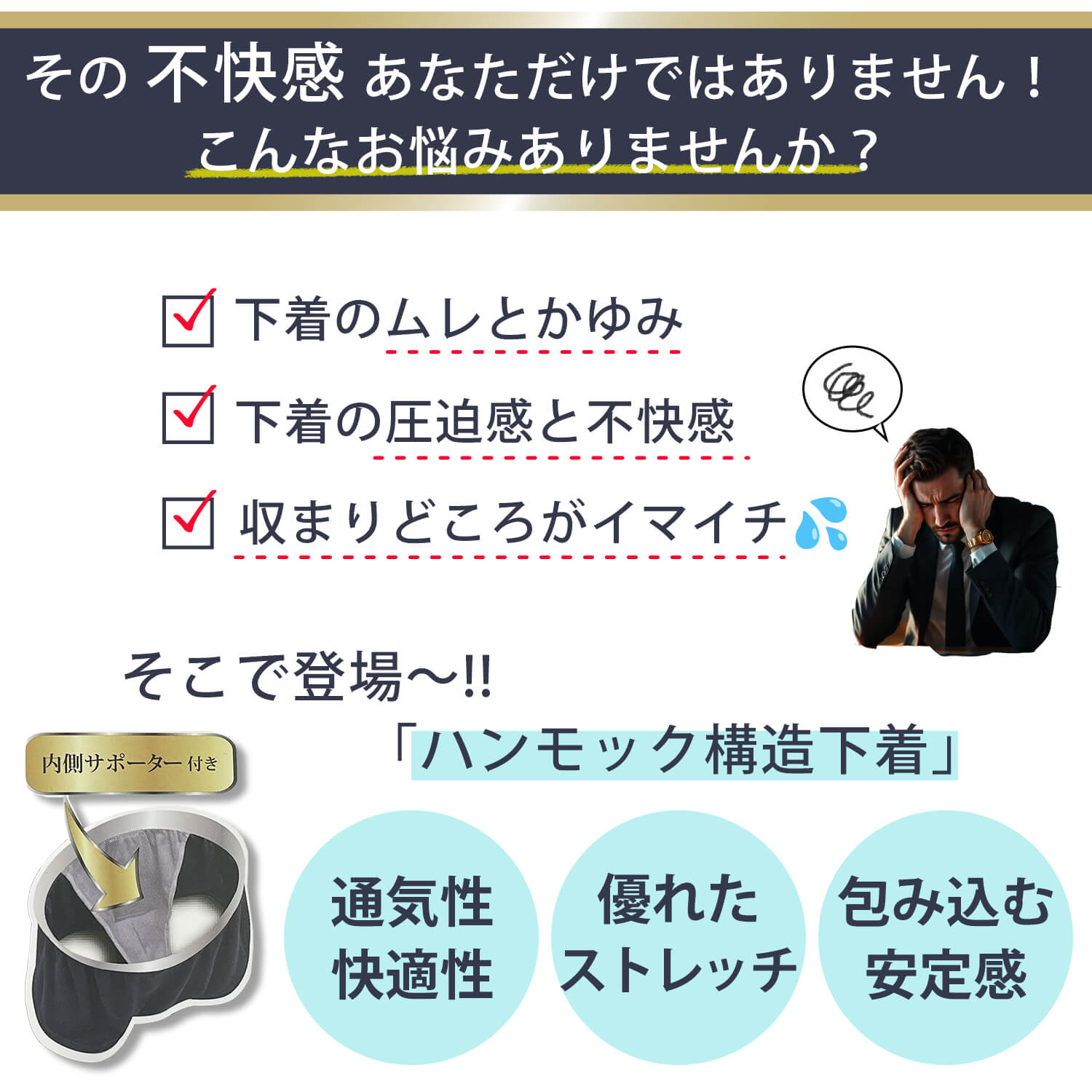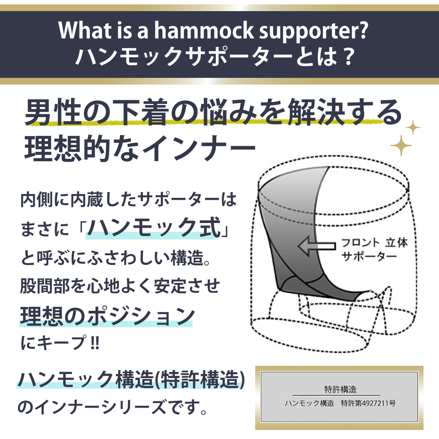 | ブランドヒストリー | ■G-HOUSE/ジーハウスのHAMMOCK SUPPORTER/ハンモックサポーター 登場から20年以上も売れ続けているロングセラーです。 トランクス内部にフロント立体サポーターを内蔵し「ハンモック式」の構造で締め付けることなく、股間部を理想のポジションにキープし心地よく安定させます。 男性の悩みを解決する理想的なハンモック構造(特許構造)のインナーシリーズです。 |