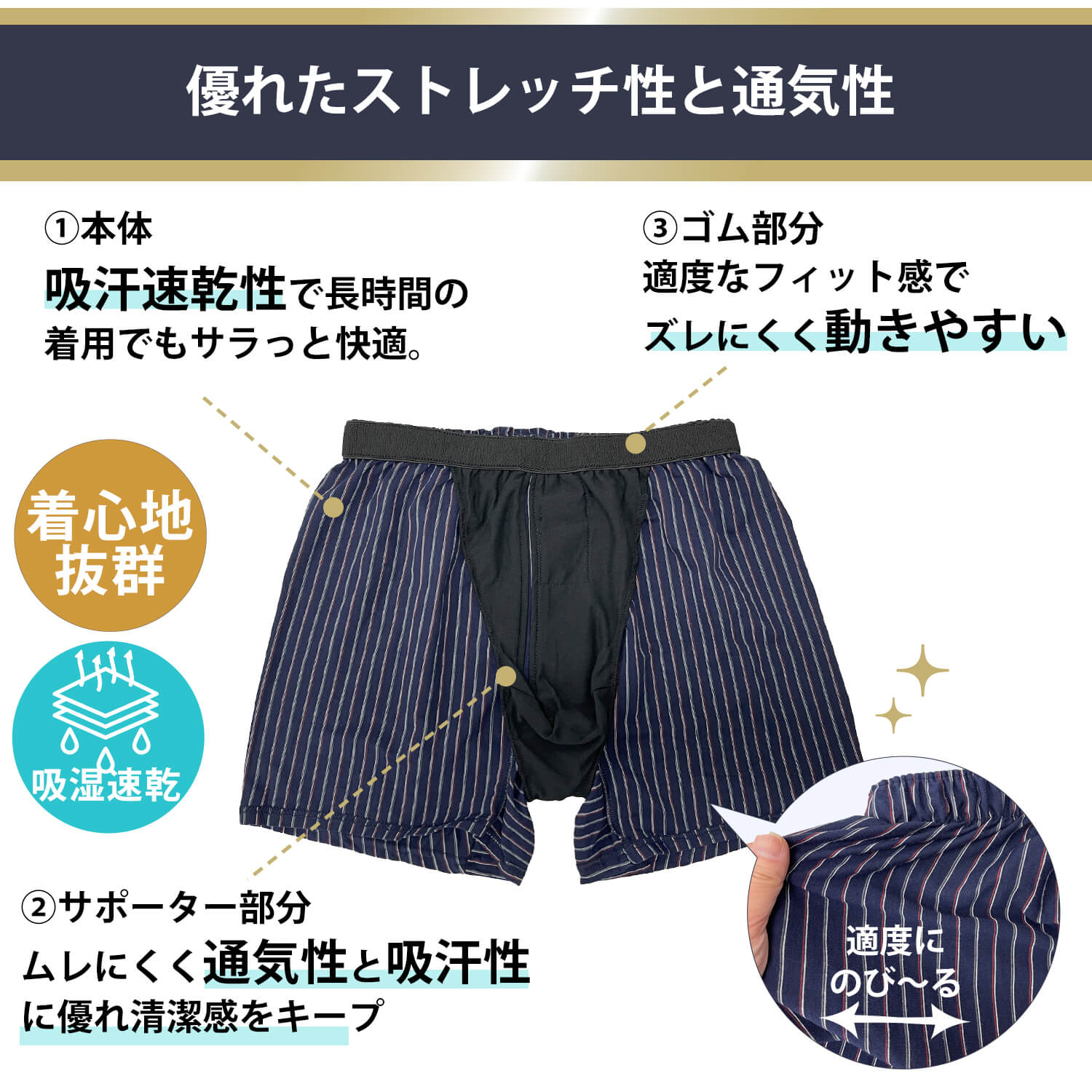 | 商品説明 | ■素材 綿のやわらかい肌触りと、ポリエステルの速乾性を両立した綿混天竺素材を採用。汗をかいてもベタつかず、1日中さらりとした快適さをキープします。 サポーター部分にも同素材を使うことで、通気性・吸湿性に優れた快適設計を実現。 ■デザイン 品のあるストライプ柄で、シンプルながらもスタイリッシュな印象に。前開き仕様で使い勝手もよく、シニア世代の方にもやさしいデザイン。 ウエストゴムはしっかりフィットしながらも締め付け感が少なく、快適なはき心地をサポートします。 ■POINT ・フロント部分にハンモック構造の立体サポーターを内蔵し、やさしくしっかりとホールド。下着を直す頻度が減るから、周囲の視線も気にならない。 ・吸汗速乾素材で、汗をかいても快適な着心地をキープし、仕事中も不快感ゼロで集中力が途切れない! ・綿混の天竺素材で肌触りが柔らかく、長時間の着用も快適。 ・内ももとの接触を減らし不快感を軽減、ムレやかゆみから解放され朝から夜までストレスフリー! ・ストレッチ性に優れた素材で動きにしっかりフィット。自転車移動や長時間の車移動でも、快適な履き心地が続く! ■こんな方におすすめ ・日常使いや長時間の外出や旅行時にも快適に ・スポーツ観戦やウォーキングなどアクティブなシーンでも ・シニア、ご年配の方へのプレゼントにもおすすめ |