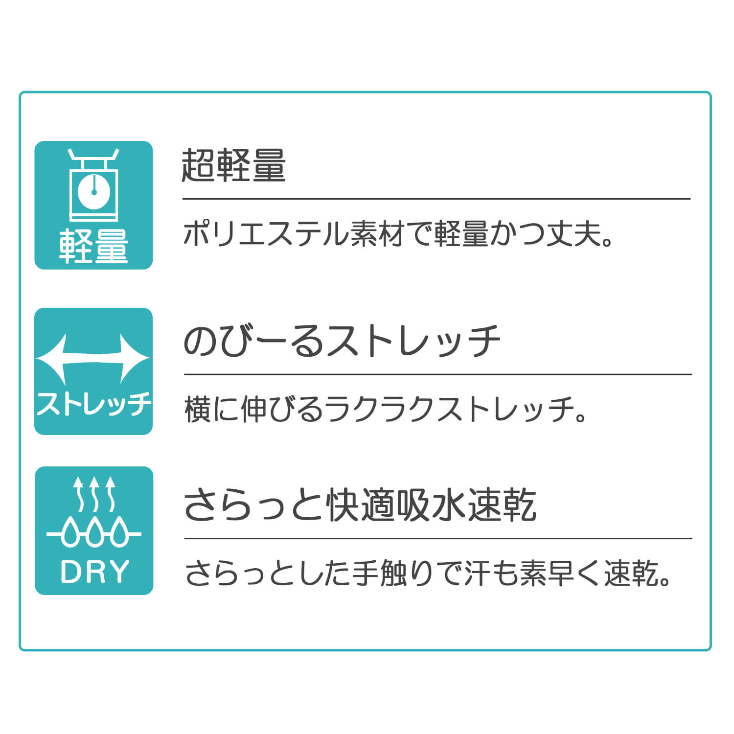 | 機能 | 吸汗速乾 吸水速乾 DRY ドライ さらさら 快適 軽量 軽い ストレッチ 伸縮性 のびる 楽ちん ポケット収納 チャック付き マジックテープ付き |