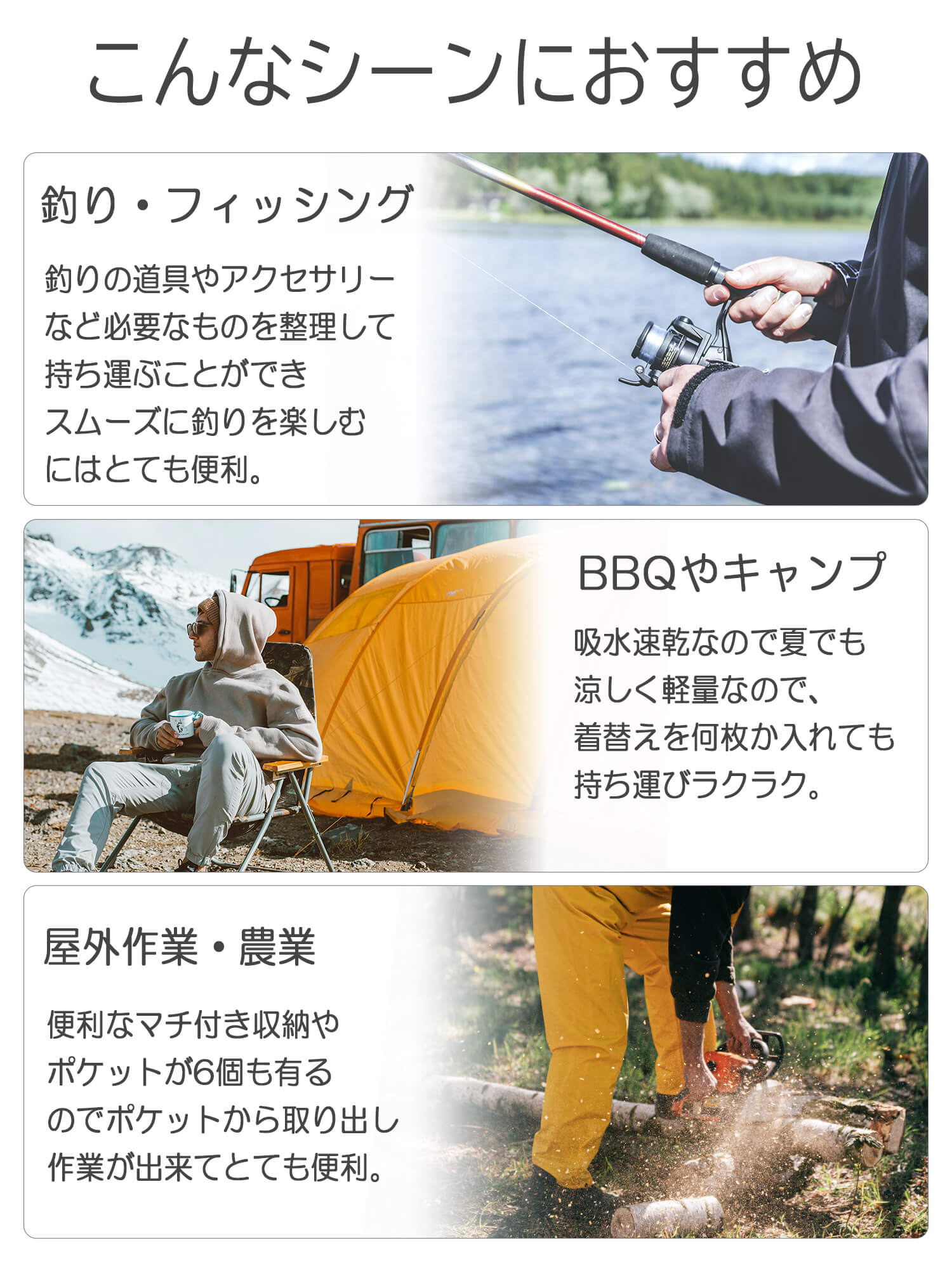| 用途/シーン | デイリー おでかけ 旅行 登山 アウトドア キャンプ 釣り フィッシング 作業着 屋外作業 農業 トラベル ゴルフ スポーツ サイクリング BBQ 海水浴 山登り 川遊び 夏休み アウトドア |